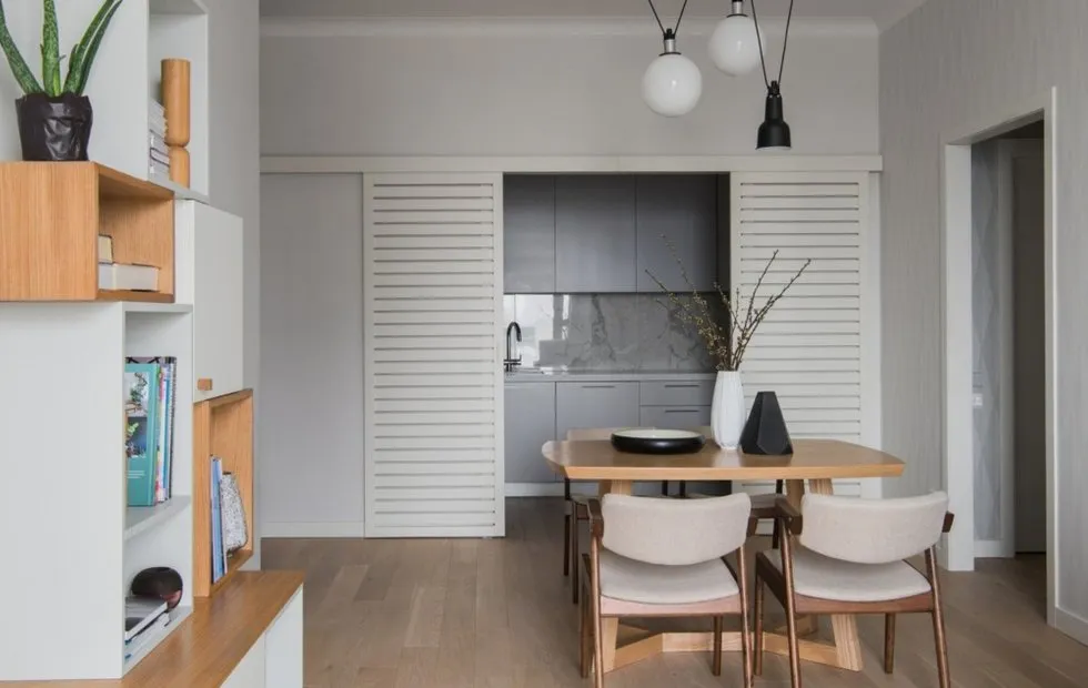 餐厅、厨房和客厅融为一体,整个空间充满光线。看看那些窗户!为了圣诞节装饰,使用了绿色金色调代替传统的红色新年色调——这增强了自然的室内环境。