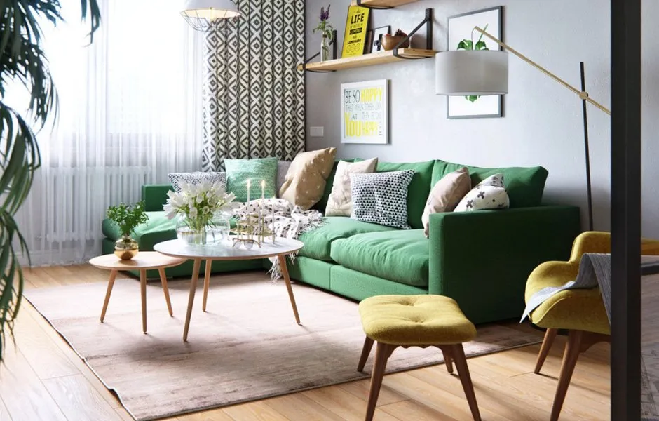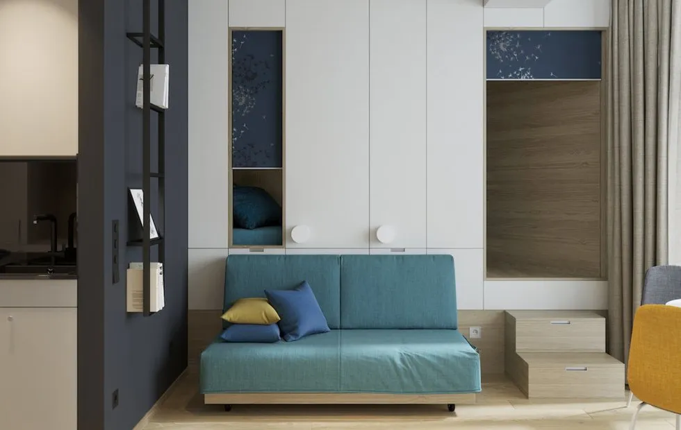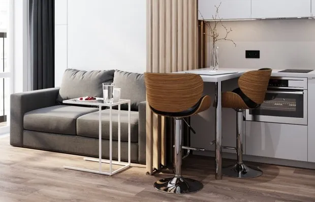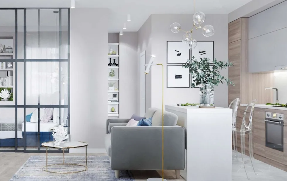 尽管客厅与厨房被合并为一个空间,但区域通过巧妙的设计划分为功能区。划分基于一个简单的矩形:仔细观察你会发现厨房(工作台面和上方壁龛)、带有窗户的用餐区以及配备沙发的放松区——所有视觉元素都呈现出矩形轮廓。