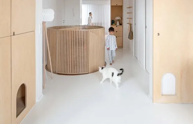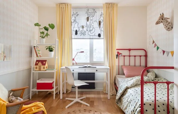 为了避免在33平方米的空间内显得拥挤,业主选择不安装室内门,而是用厚窗帘代替。卧室装饰方面,他们设计了两个带本地照明和储物箱的壁龛。