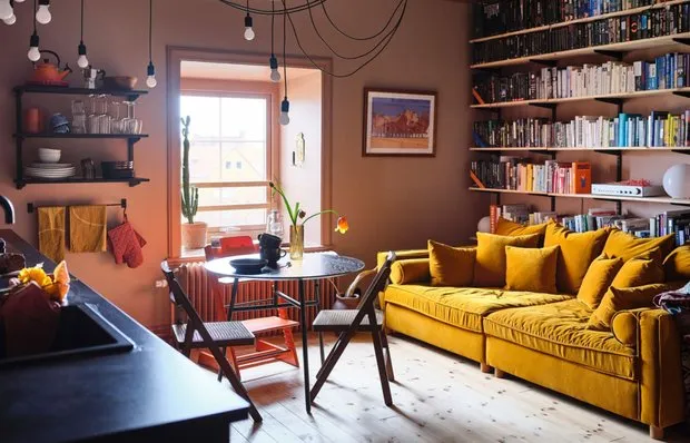 在厨房中,阳台与公寓其余部分之间有一面非常狭窄的墙,无法容纳任何柜子。设计师阿纳斯塔西娅·扎尔卡不想浪费宝贵的空间,于是想出了一个解决方案——她放置了一个宜家书架,完美契合这个壁龛!