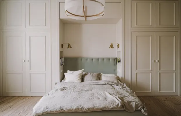 这套三居室小公寓的走廊布局非常糟糕——有许多门洞。为了合理利用空间,IVA事务所的设计团队在壁龛中放置了一个大型衣柜用于衣物收纳。