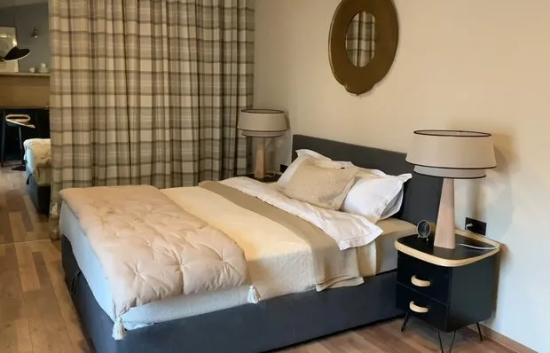 在卧室里,这对夫妇实现了他们长期以来珍藏的几个原创构想。例如,床头板上装饰着阿曼达在哈德逊河旅行中找到的一根原木。储物系统则用窗帘遮掩。
