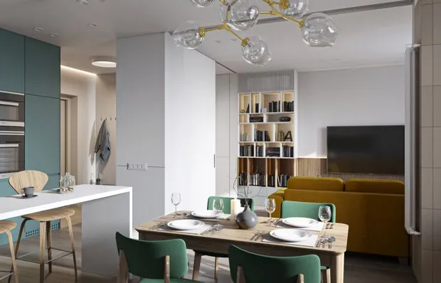 小尺寸和有限预算并未阻止设计师为年轻家庭打造舒适的空间。客厅容纳了沙发、电视和工作区。睡眠区域设计成折叠式——床从柜子的一个隔层展开。