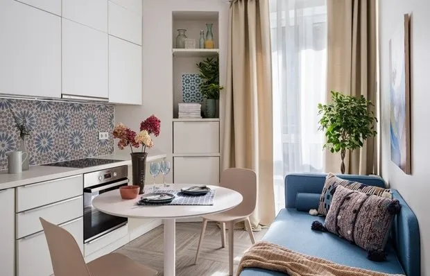 厨房与客厅融为一体,简直是色彩的爆炸!为了不让狭小的空间显得拥挤,设计师用白色厨房围裙平衡了鲜艳的色彩搭配。