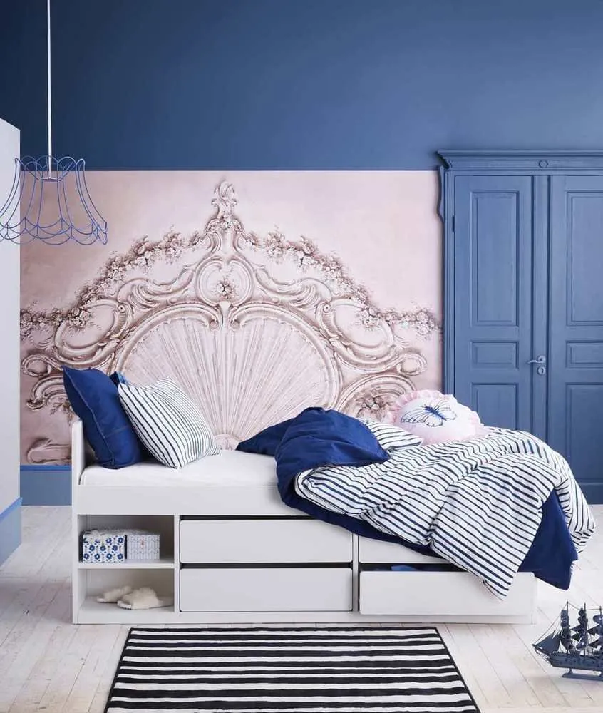 您可以自由设计床的正面:可做成简单的仿门面,使其看起来像两扇大门,或如说明作者一样,用装饰贴面营造出整体抽屉系统的视觉效果。
