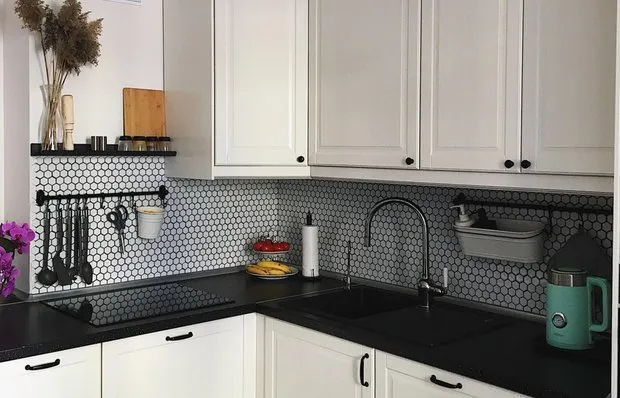 为了保持loft风格,使用了仿混凝土的瓷砖。在浴室墙面和厨房台面都采用了相同设计。