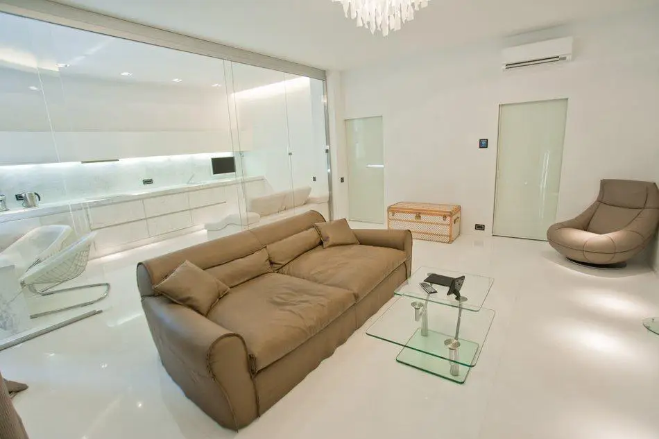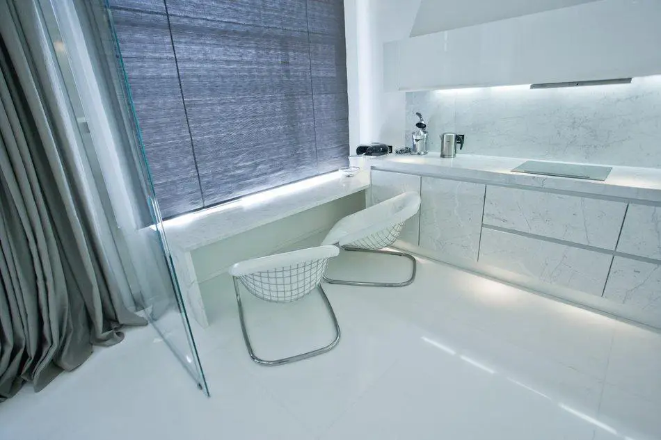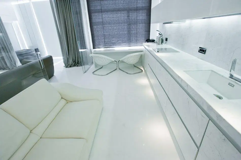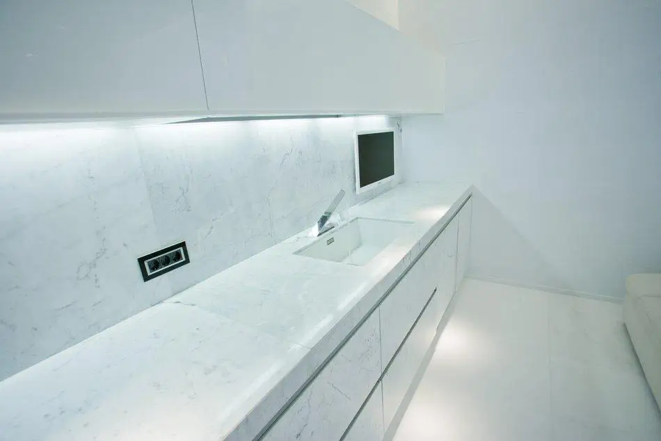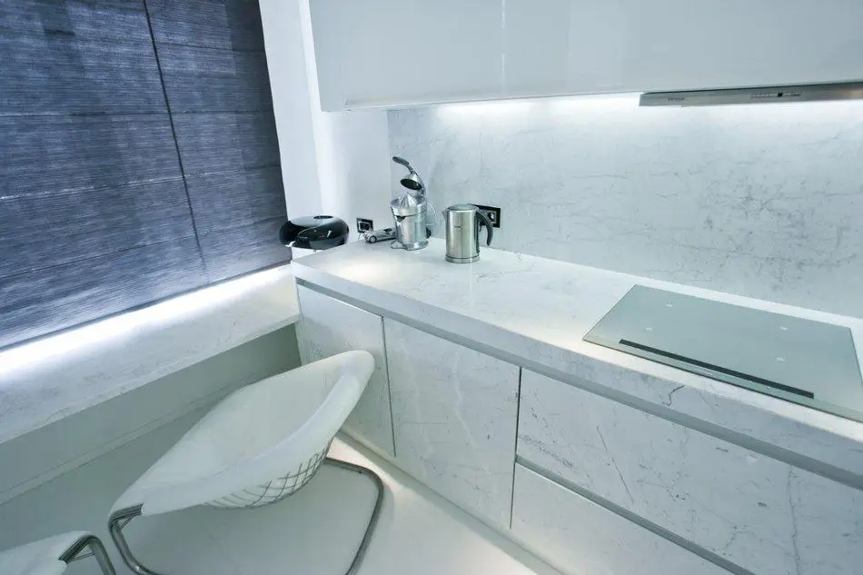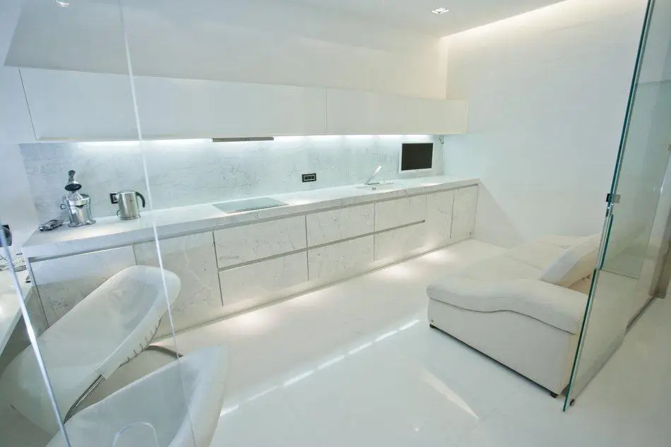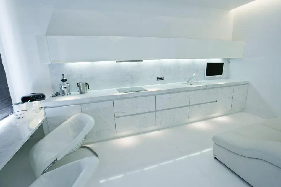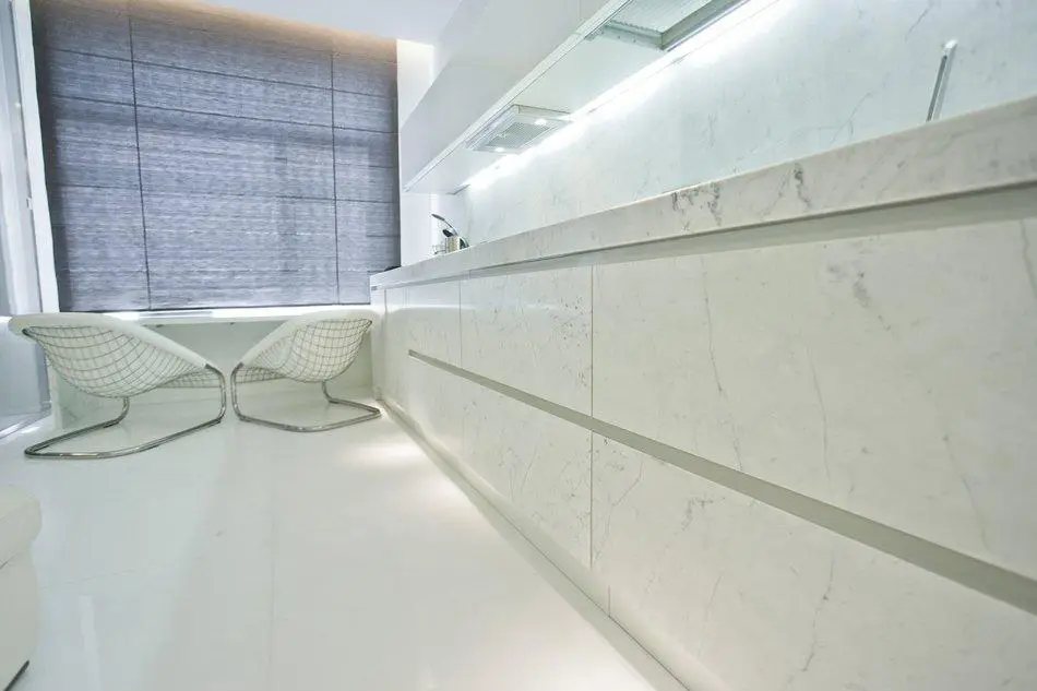 因此,色彩方案保持简单而宁静(白色、灰色、米色和棕色),尽管纹理却并非简单——在整个空间中使用了奢华材料:地板采用大理石板,墙面使用皮革饰面。厨房完全定制制作,门板、台面和墙板均选用Statuario大理石。