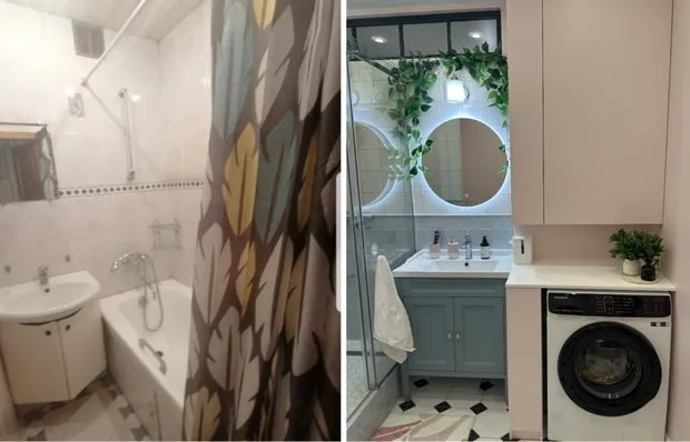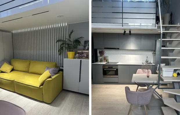 叶卡捷琳娜长久以来的梦想是拥有一个柔和蓝色的厨房。她选择了双排橱柜,配备了大量储物空间。靠窗的一侧设有工作区,包括水槽、咖啡机和带内置抽油烟机的炉灶面板。台面延伸至窗台,增加了实用操作面积。