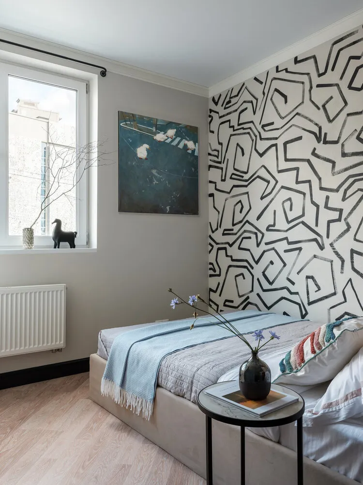 Archbutik工作室将公寓设计以个性化为主打,主装饰亮点是一面手工绘制的墙面彩绘,为室内增添动感并使其独特。