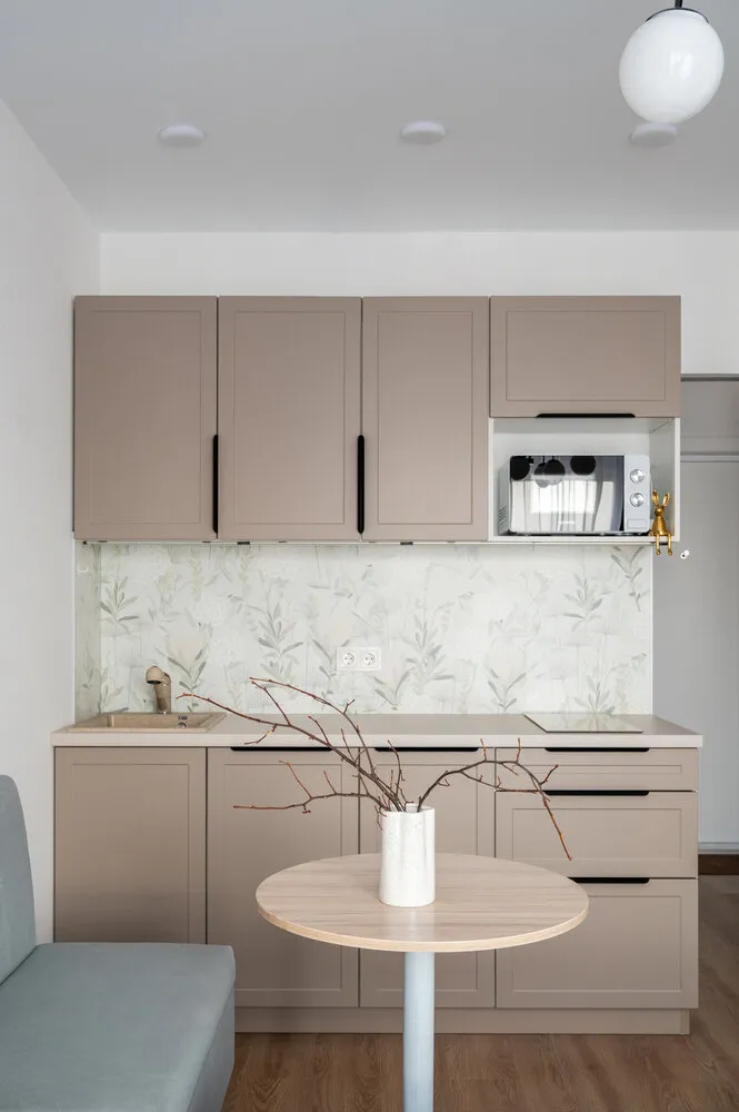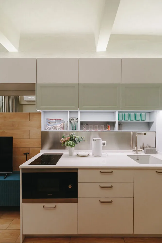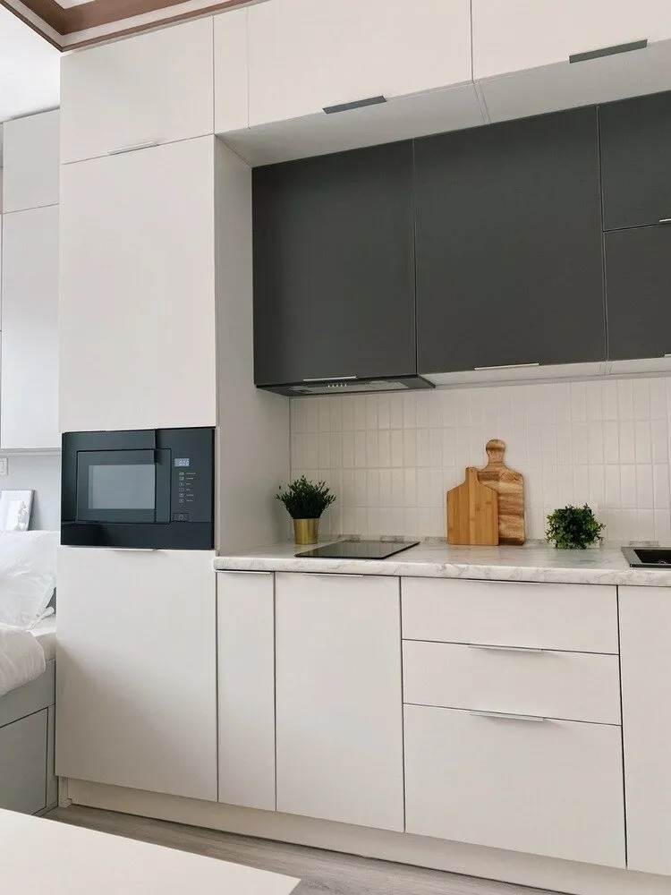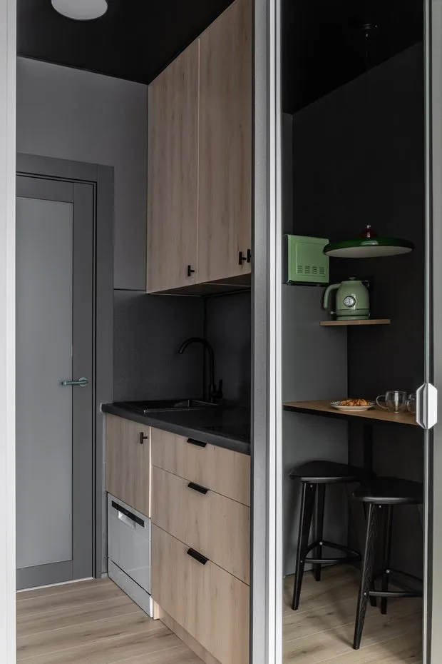 设计:尤莉亚·科列斯尼琴科和娜杰日达·沃因厨房定制设计:包含嵌入式冰箱、微波炉带烧烤功能、紧凑型炉灶面板,甚至设有茶壶位。入口区域采用轻便家具,避免空间拥挤。