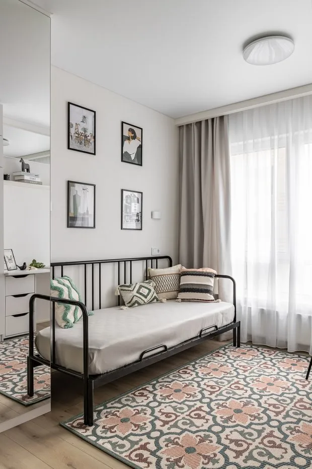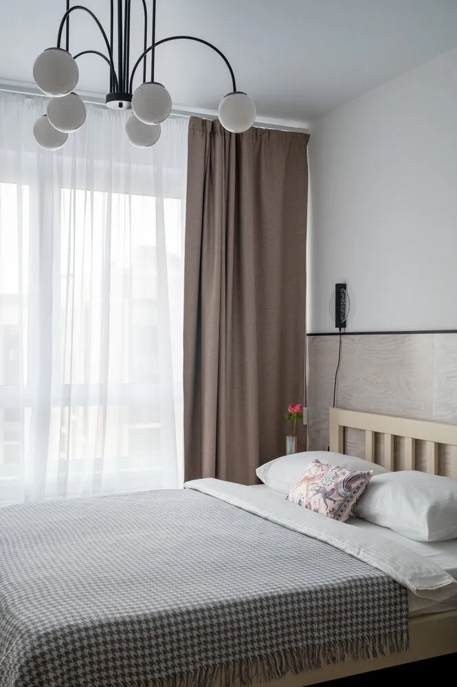 设计:Archbutik工作室通过家具和窗帘进行功能分区,避免了隔断。紧凑型厨房配备所有必需品,冰箱隐藏于门板后。储物系统设置在床边和入口处,使用了最实用且耐磨的材料。