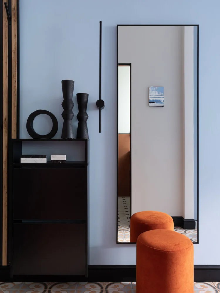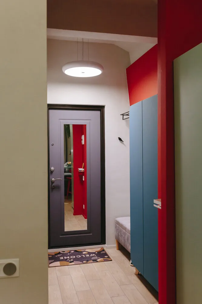 设计:波琳娜·达迪科窗户上方的镜子在视觉上扩大了空间高度,创造了全景效果。客厅与入口区域通过红色隔断分开,不仅划分功能区,还增添了动感。