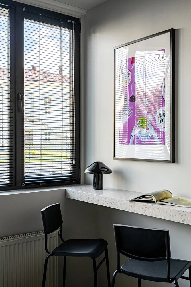 该公寓位于一座旧工厂建筑中,翻新后被改造成住宅小区。高达2.8米的层高和落地窗成为室内设计的关键元素,设计师波琳娜·达迪科巧妙运用了这些特色。