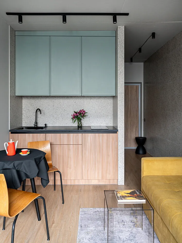 设计:安东和玛丽亚·拉祖瓦耶娃空间布局细致入微:紧凑型厨房配有炉灶、冰箱和咖啡机,用餐区设有吧台椅,休息区配有沙发及带工作区的床铺。混凝土墙面涂有彩绘浮雕,陶砖地板赋予室内现代气息。