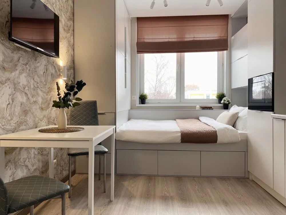 这套公寓是即便在16平方米的空间内也能打造舒适且时尚生活空间的绝佳例子。设计师安娜·马尔科娃为一位年轻女学生设计了室内,注重功能性与现代简约风格。