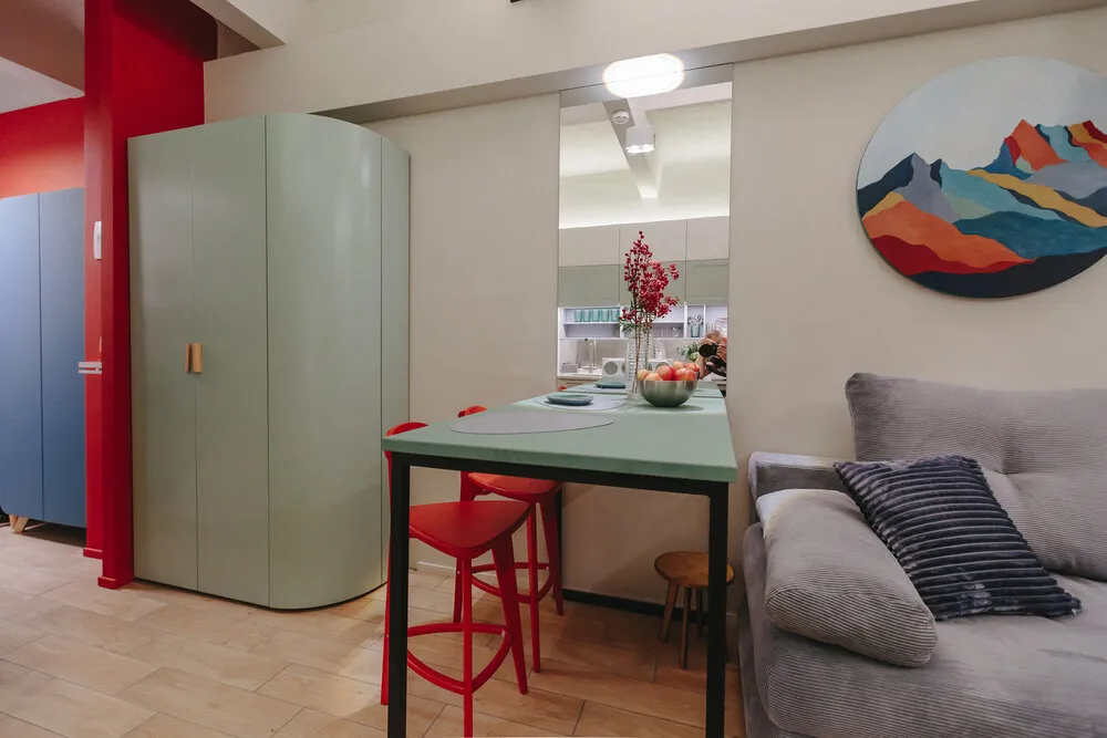 设计:波琳娜·达迪科合理的空间布局实现了所有必需功能的布置:休息区(配有沙发和电视)、厨房、用餐区、卫生间及储物系统。吧台餐桌搭配木质台面增添温馨感,鲜艳的座椅成为视觉焦点。厨房区域取消了抽油烟机,但设置了内置微波炉和实用的钢制挡板。