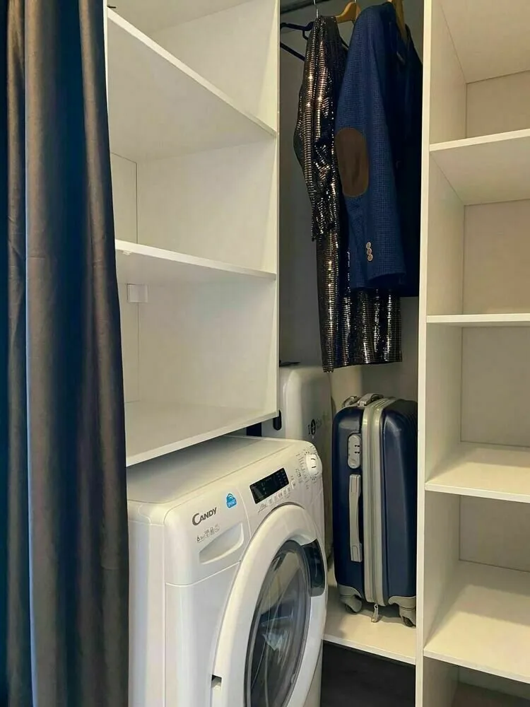 设计:尤莉亚·科列斯尼琴科和娜杰日达·沃因衣帽间内设有洗衣机、挂衣架和层板。整个室内采用明亮色调,搭配质感材料和合理照明。