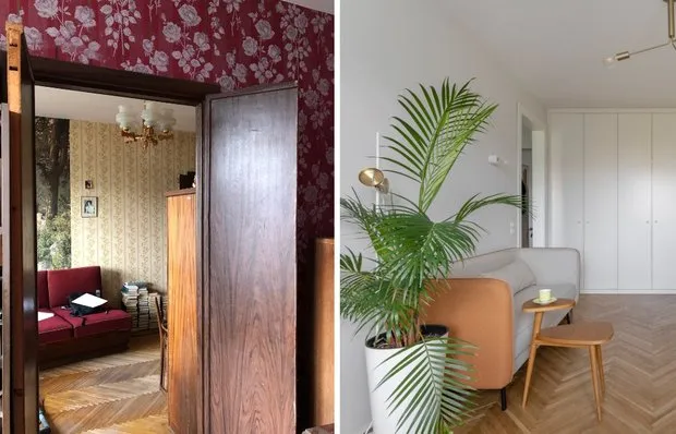 设计:安娜·贝利金娜灯具和装饰线条成为重要的视觉元素:客厅的檐口涂成与墙面一致的颜色,从视觉上增加层高;吊灯则让厨房显得更为温馨。深色墙面营造出私密感,而家具和纺织品则增添了触觉上的温暖。