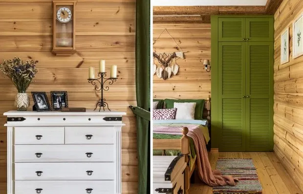 即使在小卧室中,设计师也专门留出一个完整的衣帽间区域,从而移除了多余的柜子并保留了温馨的氛围。这个解决方案适用于灵活布局的公寓。