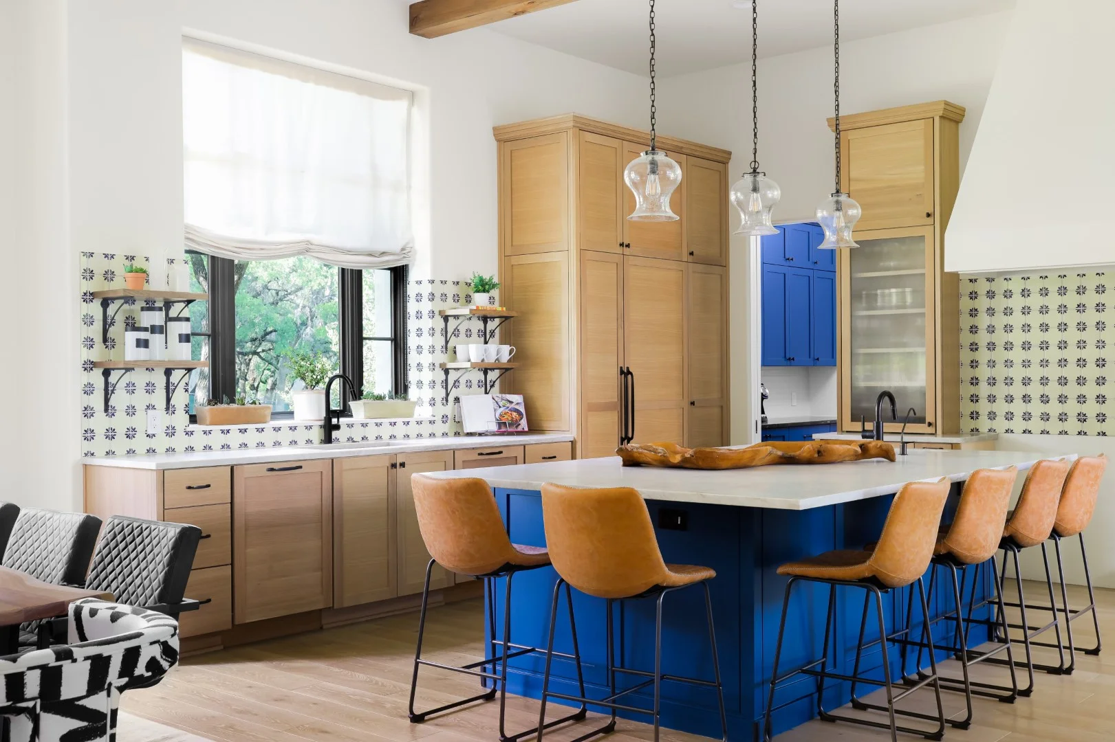 开发商最初的布局将厨房和休闲区分开。提舍勒团队重新规划了楼层平面图,将这两个区域合并成一个宽敞的55.5平方米开放式厨房和客厅空间。透过大窗户进入的自然光,凸显了橡木威尼斯百叶窗和浅色瓷砖地板。桌面R9音响系统与激光投影仪及隐藏式屏幕相结合,使空间同时具备温馨的家庭影院功能。