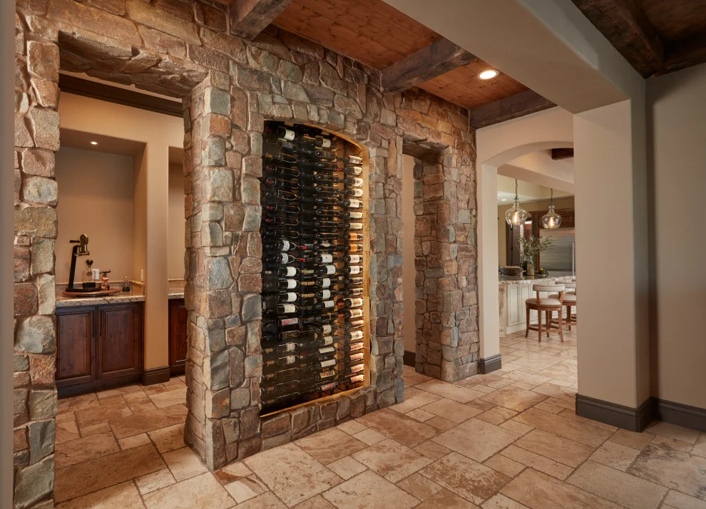 深色的厨房搭配日常电器功能区,与石英岛台相得益彰,包含隐藏插座、抽屉和酒柜。极简主义风格延续至边缘瓷砖护墙板、带抽油烟机的炉灶台面以及来自Vibia和CVL的时尚吊灯。