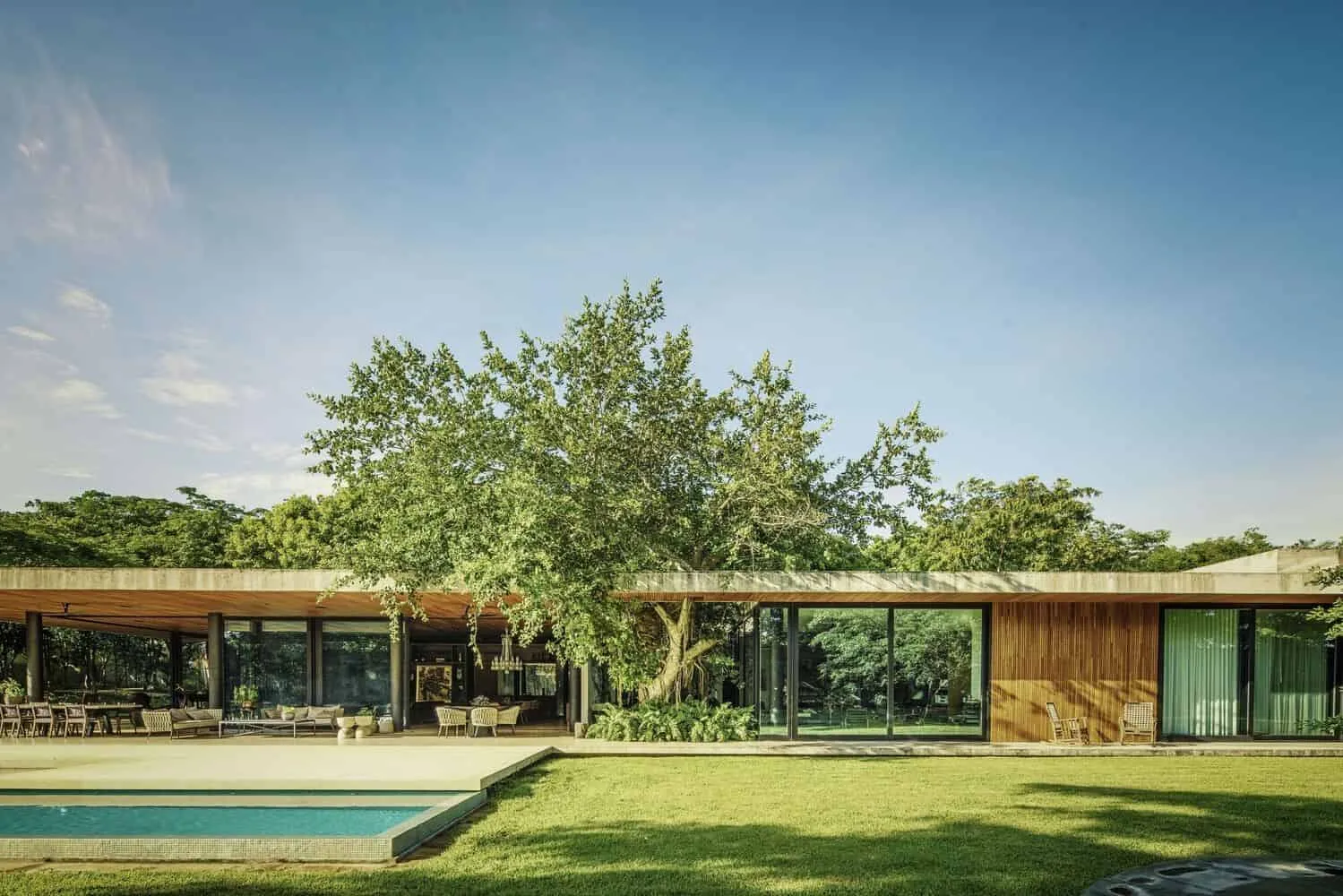 被动策略虽静默却高效。深悬挑和采光井减少了太阳辐射;层叠开口协调空气流通;周围水景冷却空气并调节基部微气候。长屋顶过滤雨水和阳光,季节性藤蔓提供额外遮荫。坚固且低维护的材料——石、板岩、柚木和石灰——优于机械系统,偏好被动式可持续性。