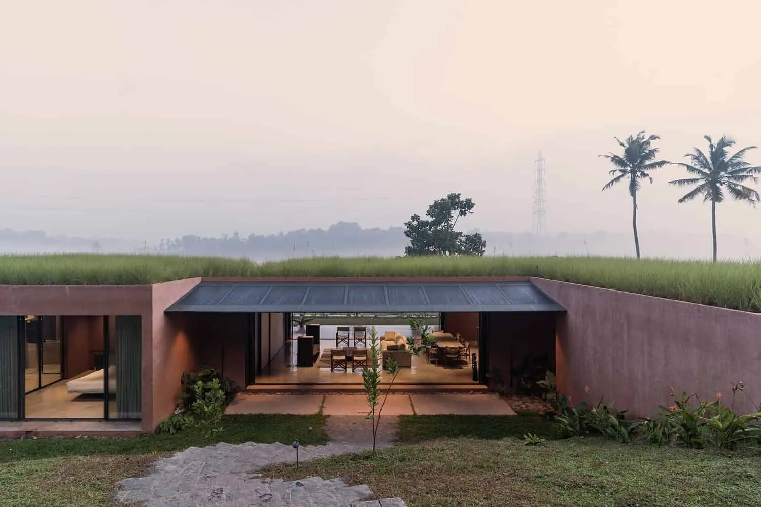 住宅位于地块后方,使得草坪和庭院提供视觉与热防护。周围的水景环绕着建筑底部——冷却空气、驱赶害虫,并形成反射池,柔化地面与建筑之间的过渡。