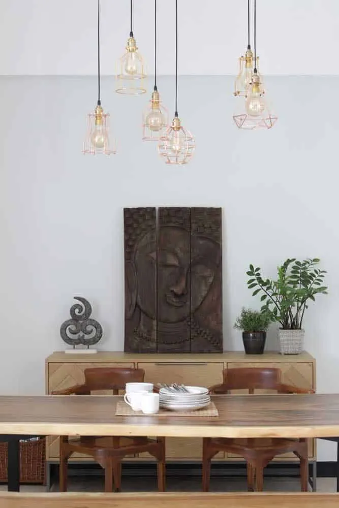 公寓客厅配备了意大利品牌的家具,但Minotti品牌的餐桌尤其值得一提。它采用了日本茶道风格的“伊萨基”设计,意在让所有客人共同享用菜肴。餐桌区域由英国品牌Cameron Design House为该项目特别设计的个性化吊灯完成。
