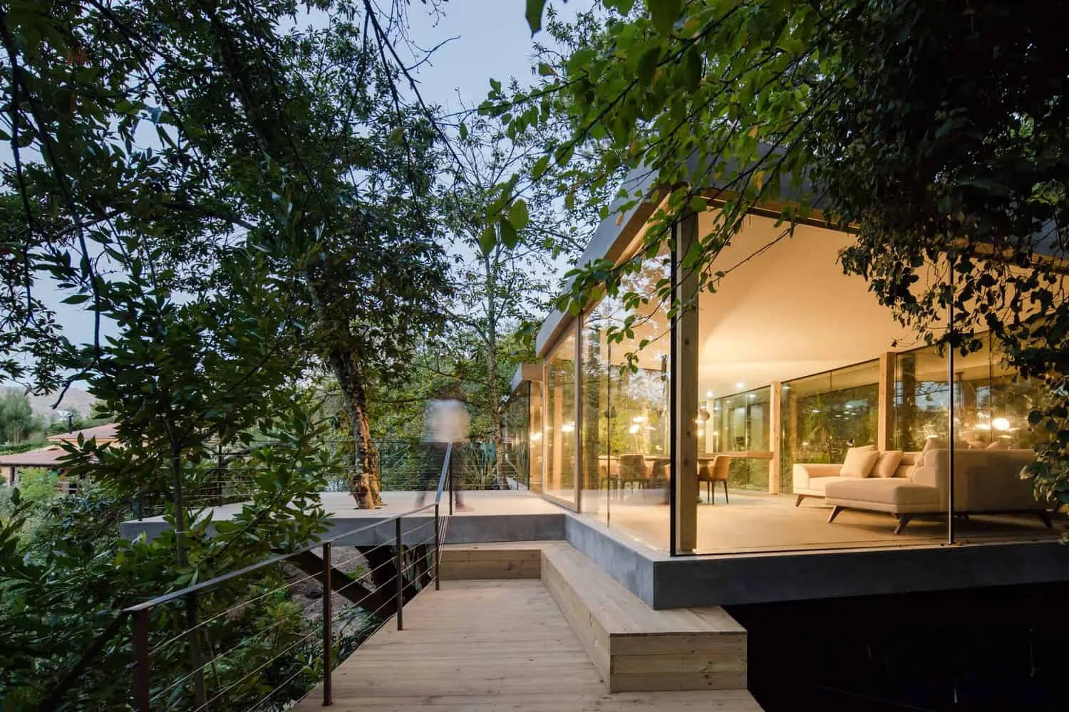 L形设计与重叠的空间形成空腔,并似乎从地面脱离,为整体构图增添了轻盈感,并在私密(上层)和社交(下层)区域之间建立了视觉融合,这些区域面向泳池,并设有遮蔽的户外空间。钢桁架与裸露混凝土之间的对比进一步突出了结构,而大开口则提供了开阔视野和自然采光与通风。