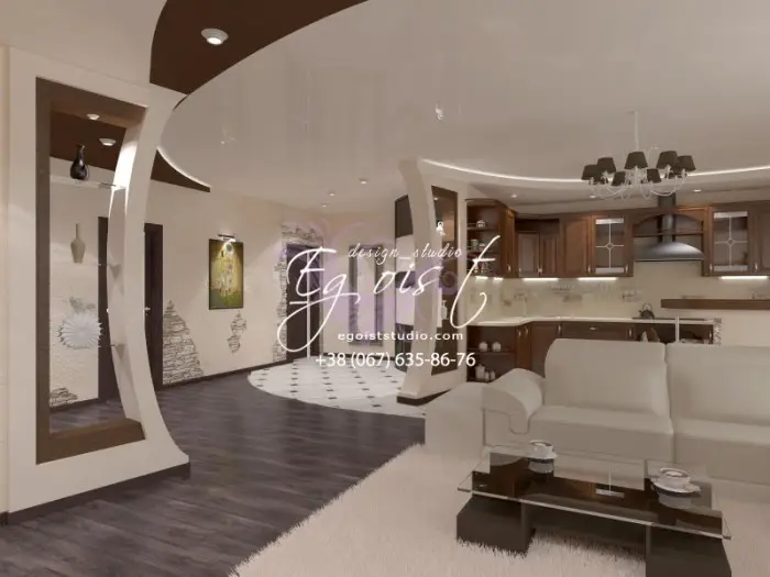 客厅代表了一个典型的现代开放式空间,包含厨房区域。没有实墙,只有轻盈和宽敞的感觉。房间中曲线、圆润的线条增添了空气感,米色墙面搭配木质和白色现代家具,营造出舒适温暖的家庭氛围。