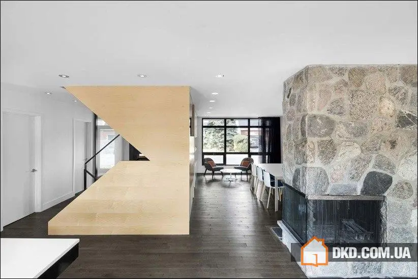这座位于加拿大圣兰伯特市克洛塞街的郊区住宅,由前业主的父亲在1960年代建造。经过超过50年的使用后,房屋急需大规模翻新。最初,由于围绕中央楼梯的多个封闭空间,房间缺乏自然光。_naturehumaine工作室的建筑师采取的第一步是打开南立面,设置大面积玻璃门通向内院。拆除现有隔断使光线深入房屋内部,照亮了新安装的由热轧钢、枫木贴面和钢化玻璃制成的雕塑式楼梯;这栋楼梯立刻成为房屋的中心特色。两扇旋转玻璃门在关闭状态时形成了冬季门廊。大型石砌壁炉得以保留并修复。房屋外观重新粉刷,所有窗户均被更换。精心挑选的简单而充满活力的材料调色板统一了整个房屋。