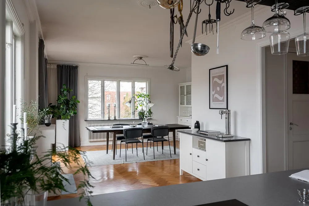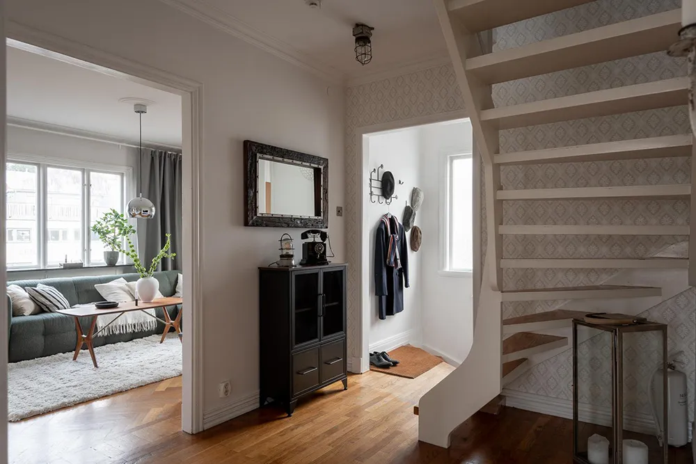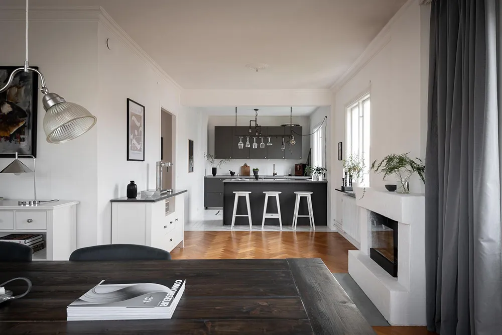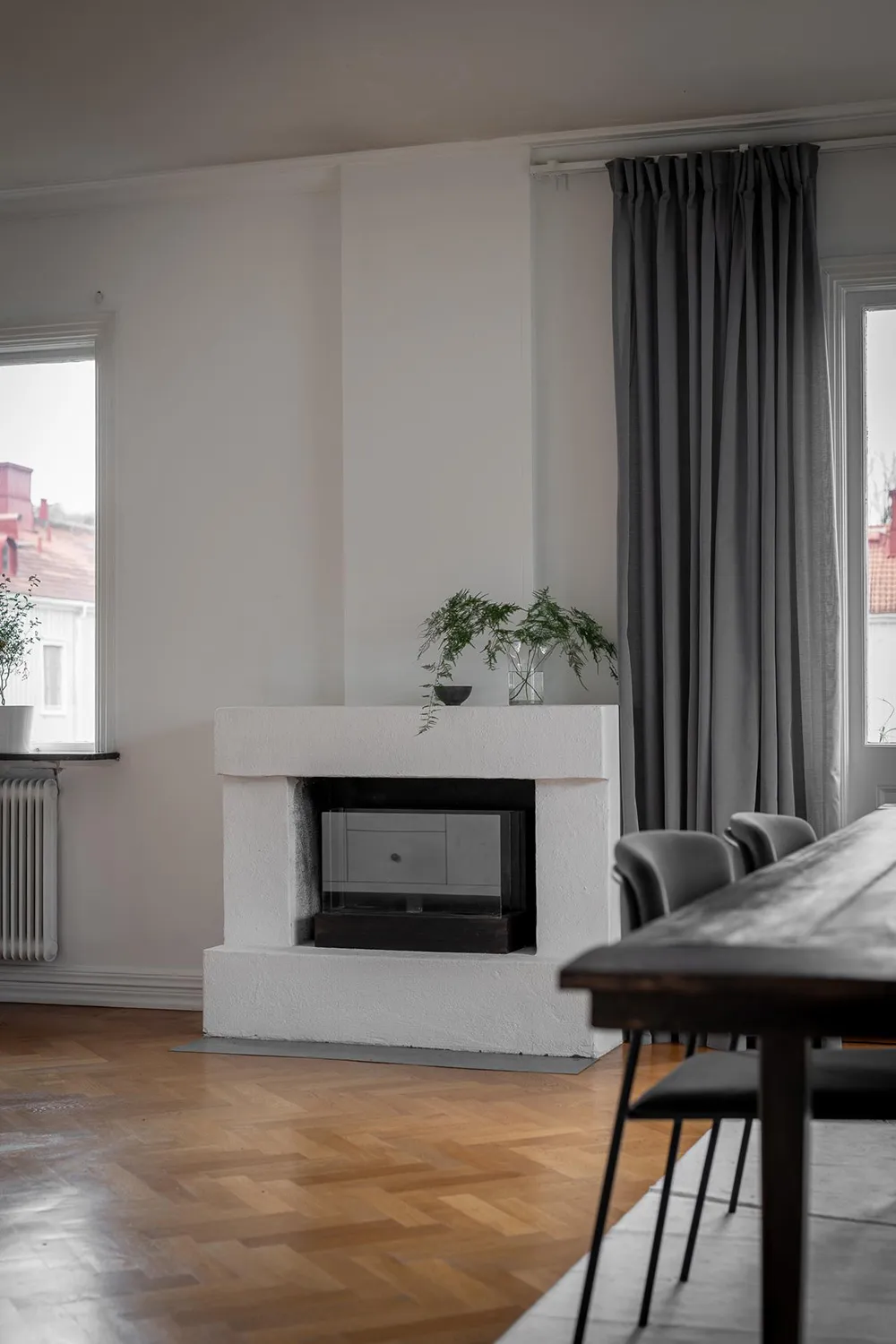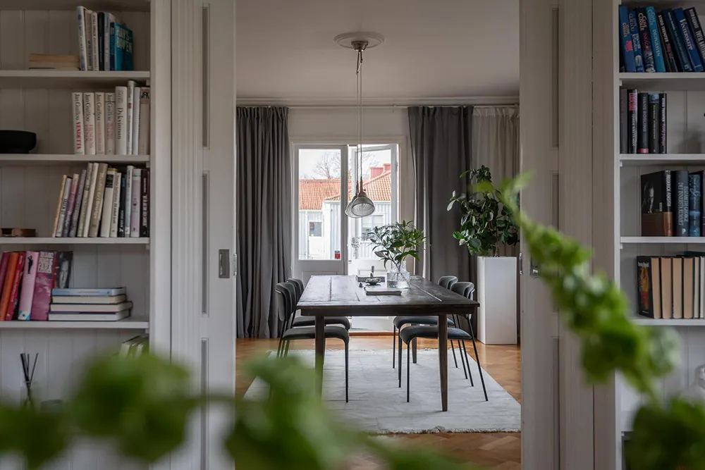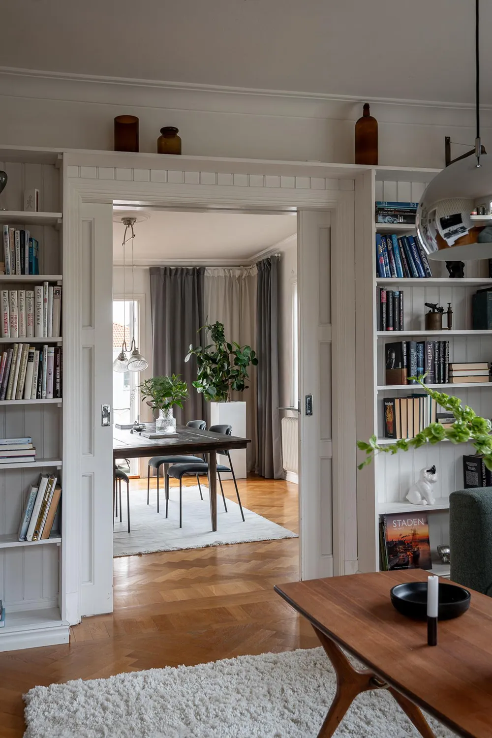 这座位于哥德堡历史悠久木制豪宅中的公寓内部完美传达了地点的情绪与情境——这是一个安静的郊区,拥有丰富的绿色植被和沉稳的小镇氛围。