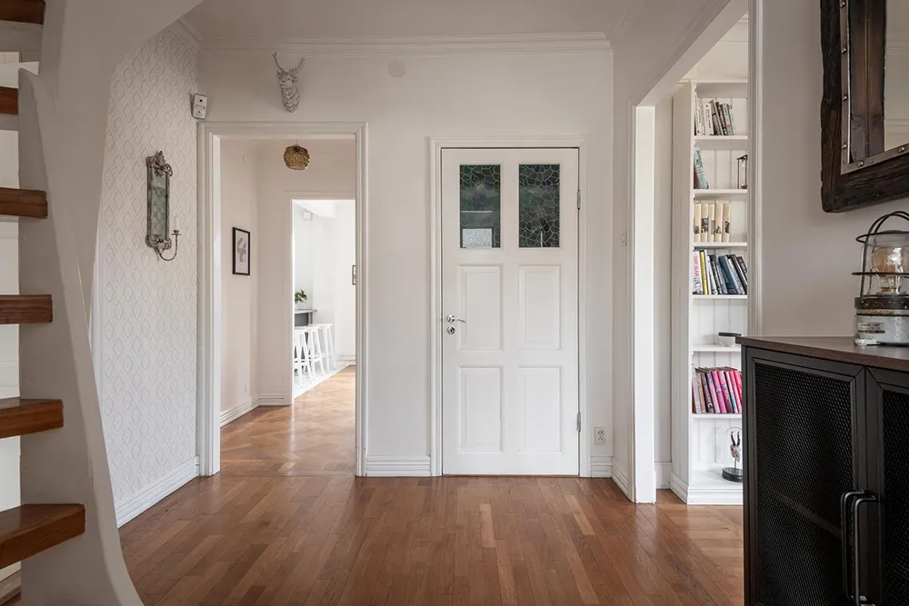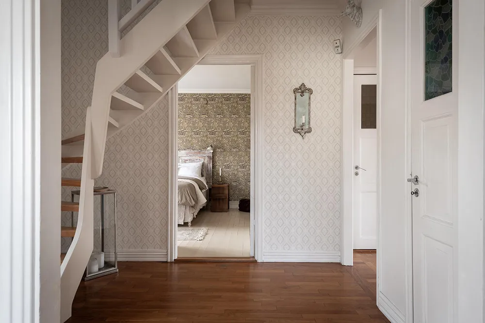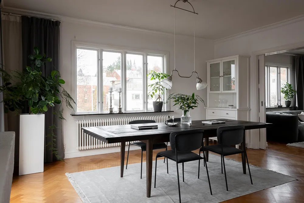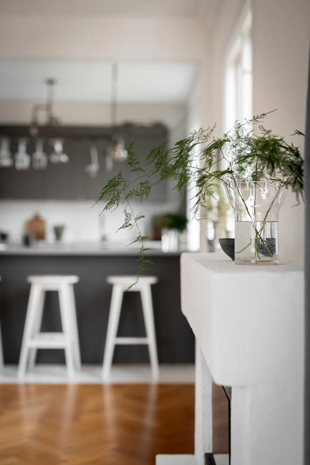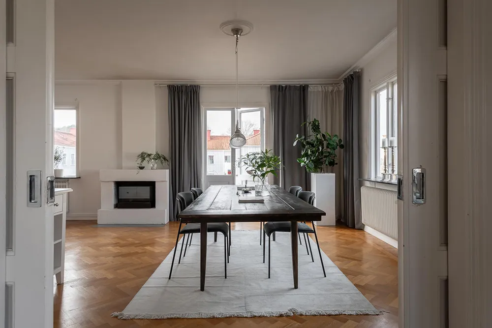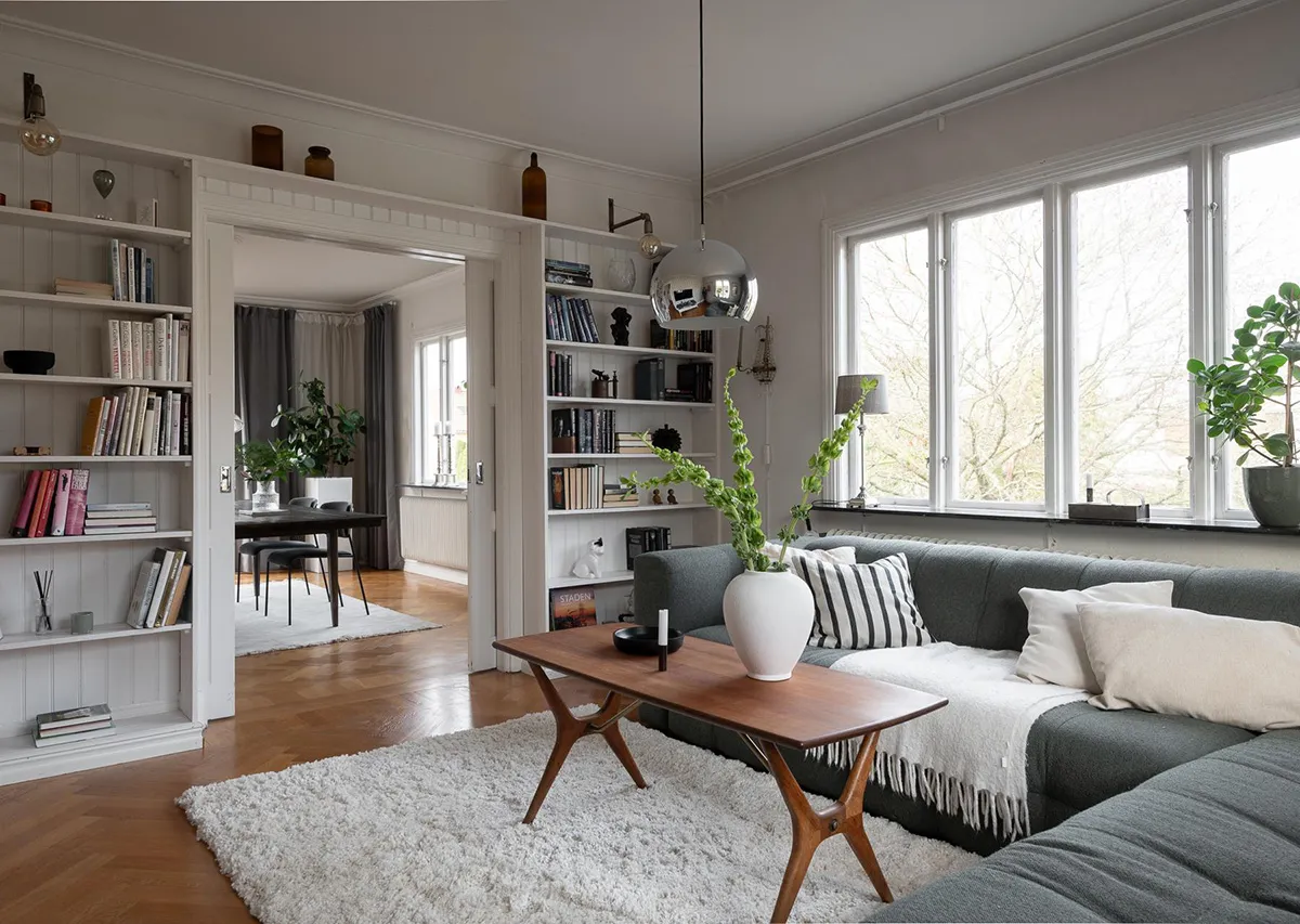 这座位于哥德堡历史悠久木制豪宅中的公寓内部完美传达了地点的情绪与情境——这是一个安静的郊区,拥有丰富的绿色植被和沉稳的小镇氛围。