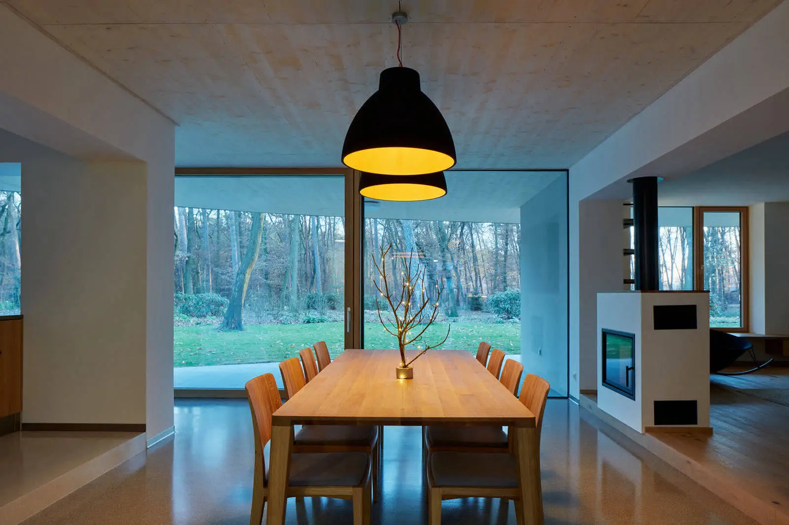 厨房采用L型操作区和高柜,材料为人工石材Corian,搭配橡木拼接地板和黑色钢墙,营造出柔和优雅的室内氛围。餐厅的主要亮点是靠窗的角落座位。"我的晨间仪式总是一样的:我坐在阁楼里喝咖啡,眺望湖面和群山,"业主说道。