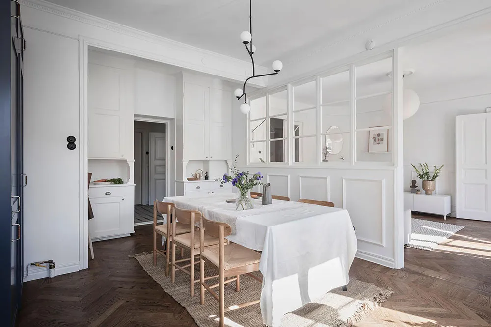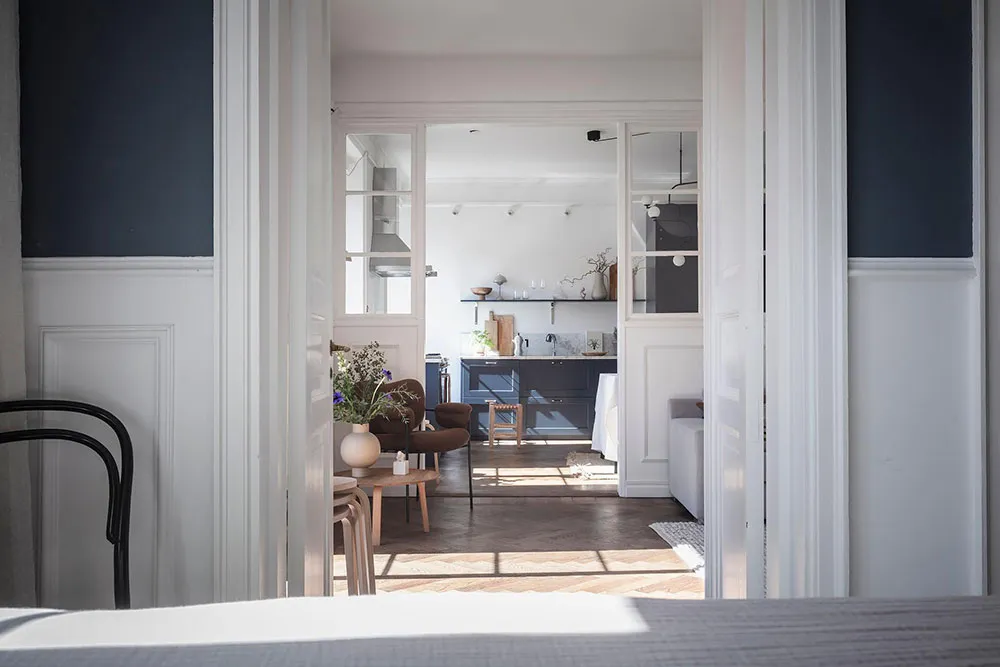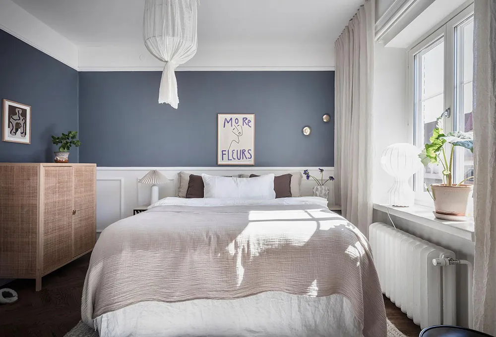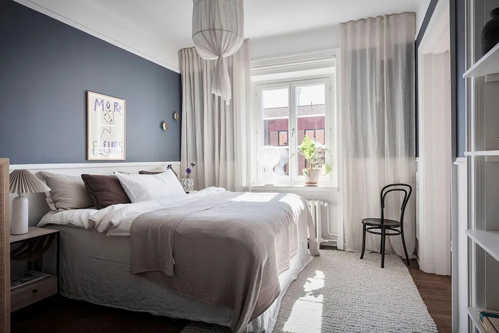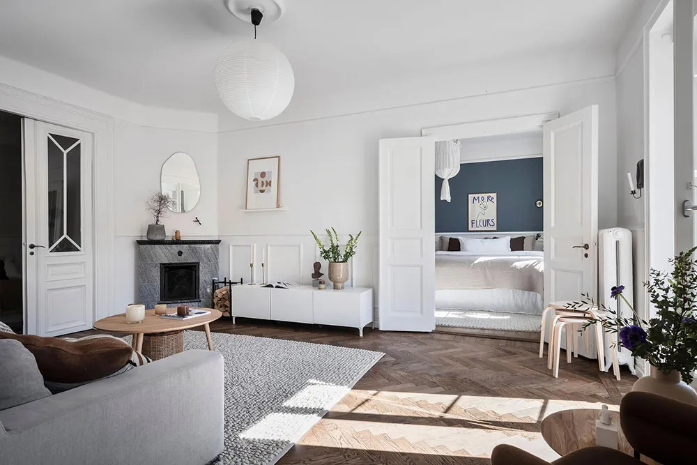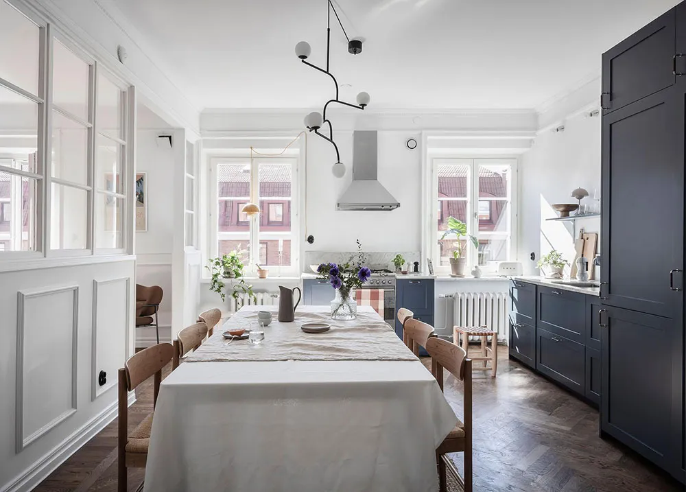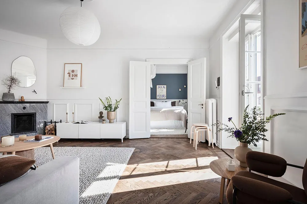 这套瑞典公寓的色彩搭配让人联想到大海与海洋的新鲜感——室内装饰采用明亮的白蓝色调,常用于海滨家居设计。