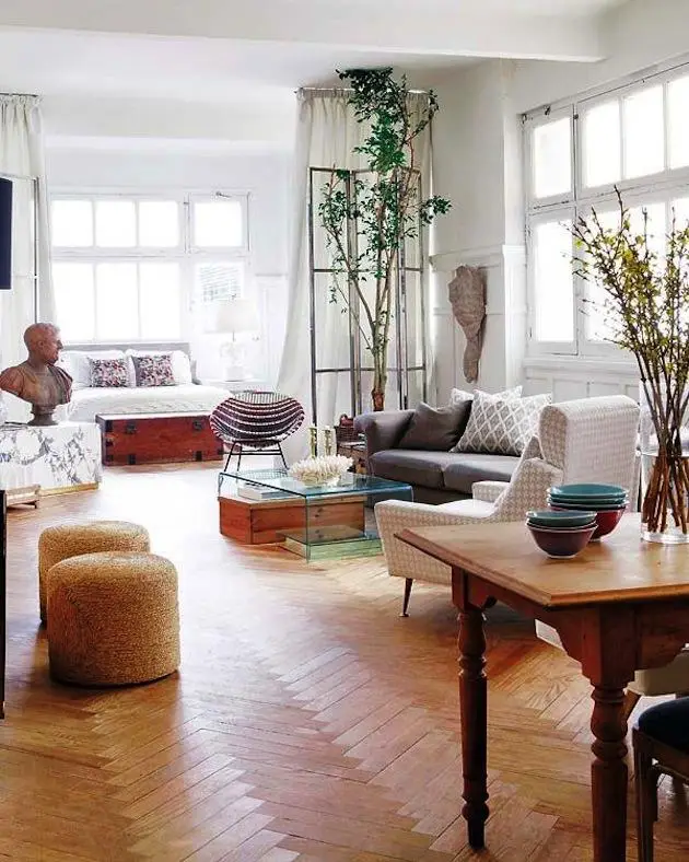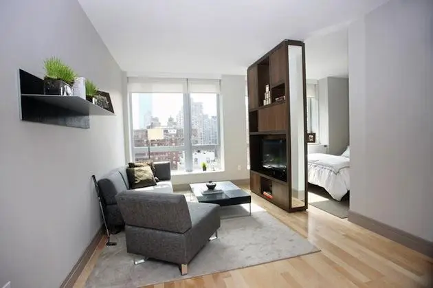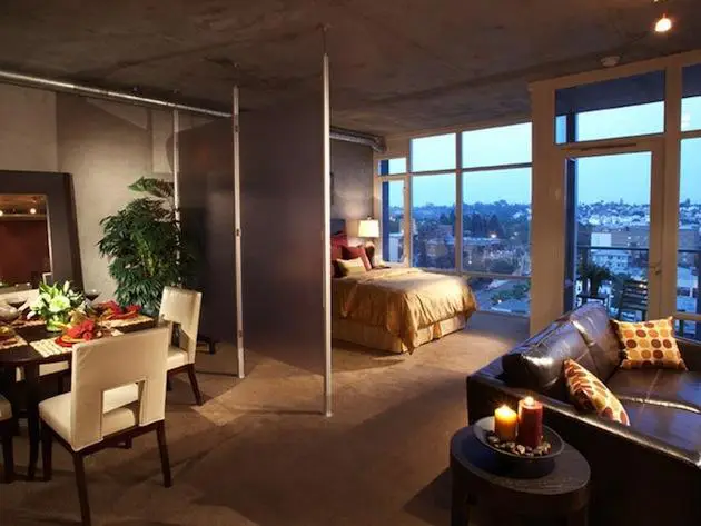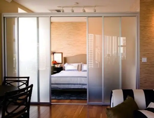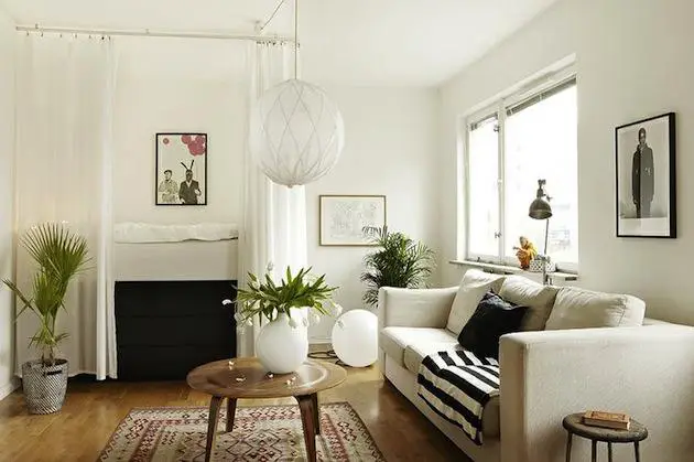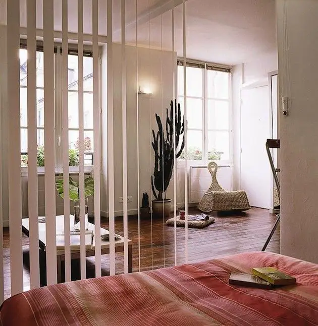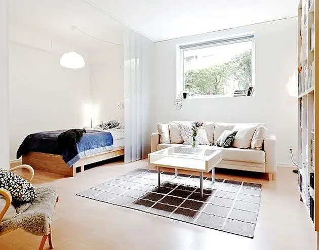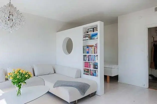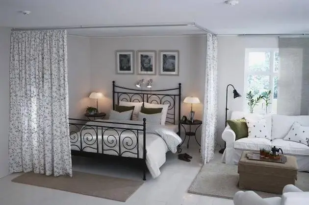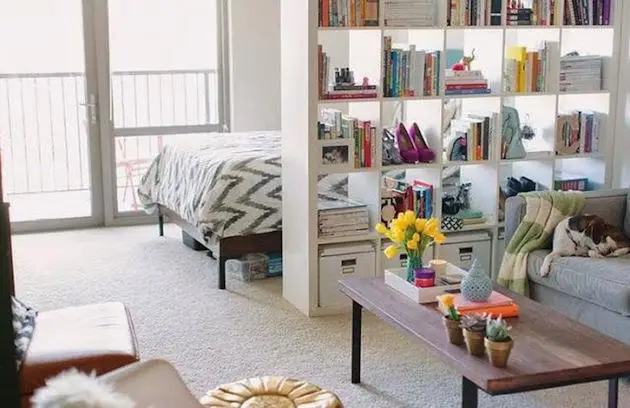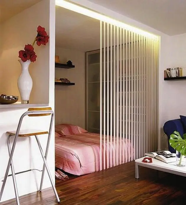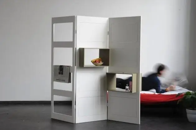 Man sollte keine massive Wand aus Ziegel oder Gipskarton bauen, um die Zonen Schlafzimmer und Wohnzimmer zu trennen. Im Wohnzimmer sollte genügend natürliches Licht sein, damit es nicht wie ein Abstellraum wirkt. Mobile Trennwände lösen das Problem der Zonierung einfach.