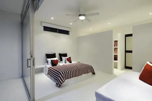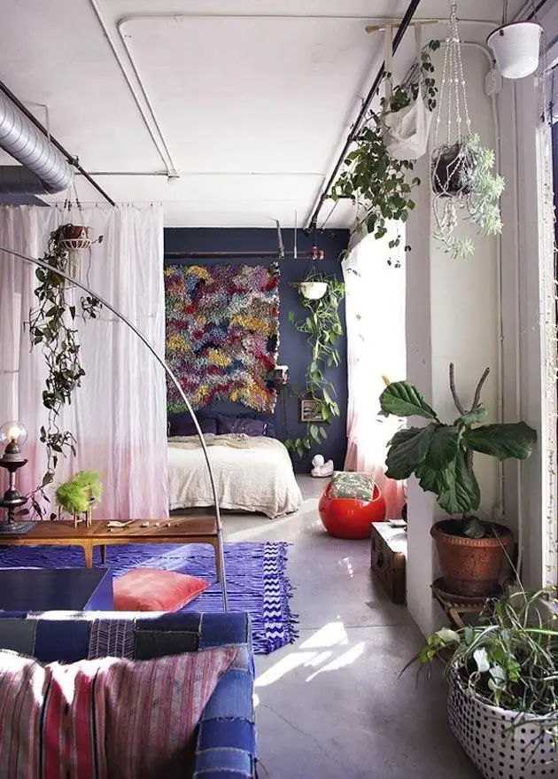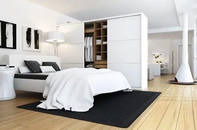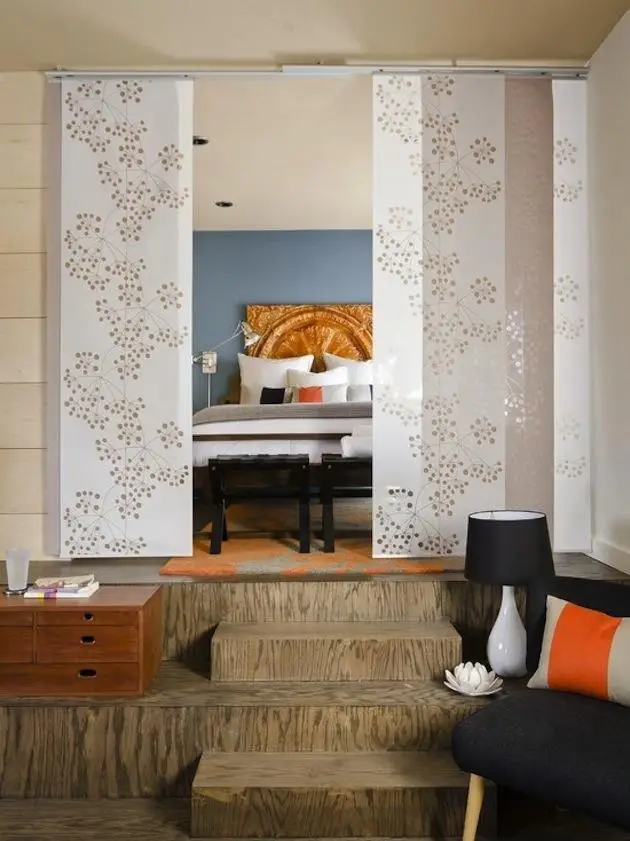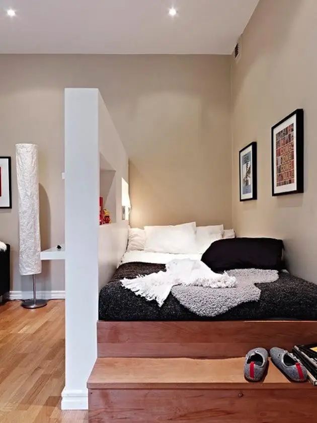 Die Schlafzimmerzone kann nicht nur durch eine Trennwand, sondern auch durch Fußbodenbeläge, unterschiedliche Bodenhöhen, Wandfarben oder Beleuchtung getrennt werden.