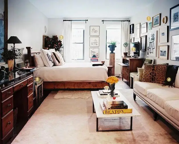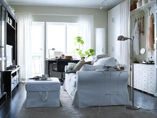 Wenn der Raum groß genug ist, können Sie ein vollwertiges Schlafzimmer und Wohnzimmer in einem Raum einrichten, indem Sie ein Doppel- oder Queensize-Bett, ein Sofa und einige Stühle platzieren. In diesem Fall wird der Raum in öffentliche und private Zonen geteilt, und die richtige Anordnung dieser Zonen ist unsere Hauptaufgabe.