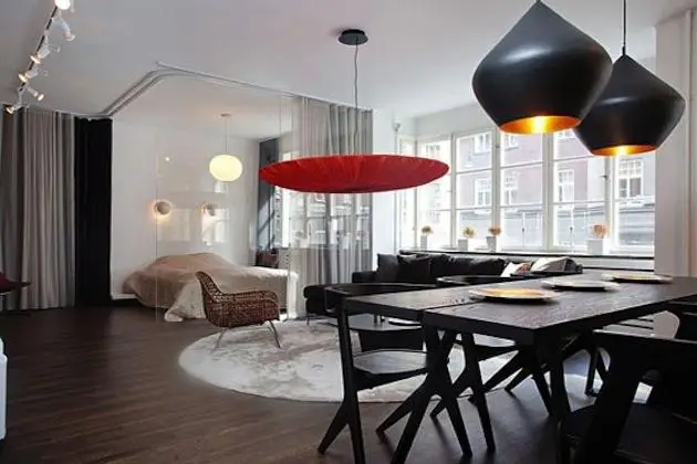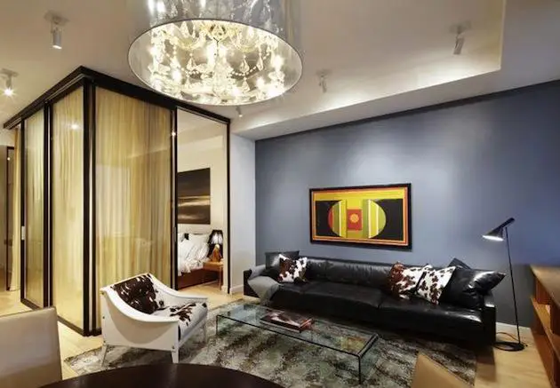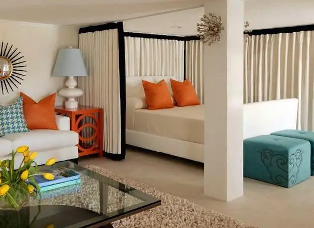 Legen Sie einen weichen Teppich in der Schlafzimmerzone, um sie vom Wohnzimmer zu unterscheiden. Installieren Sie helle Beleuchtung im Wohnzimmer, indem Sie eine schöne Deckenlampe über Sofa und Stühle hängen. Die Beleuchtung im Schlafzimmer kann durch eingebaute Deckenleuchten und Nachttische gelöst werden. Malen Sie die Wände in der Schlafzimmerzone etwas dunkler oder heller, kleben Sie kontrastreiche Tapeten an, und visualisieren Sie die Trennung des Raums in zwei separate Räume.