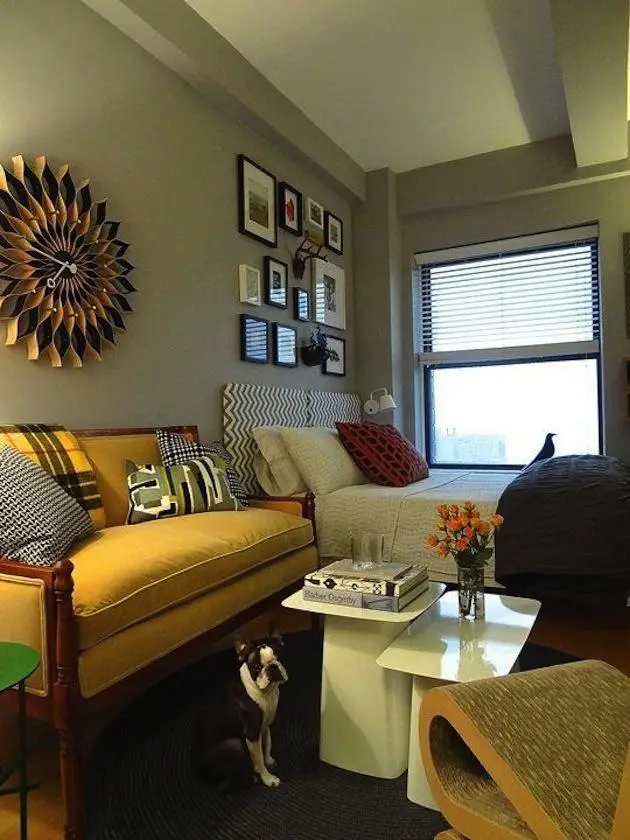 Wenn für das Schlafzimmer-Wohnzimmer-Zimmer ein kleiner, quadratischer Raum zur Verfügung steht, ist ein ausziehbares Sofa-Bett die optimale Lösung. Zum Glück bietet der heutige Möbelmarkt stilvolle, funktionale Sofas mit großzügigen Ablagen für Bettwäsche.