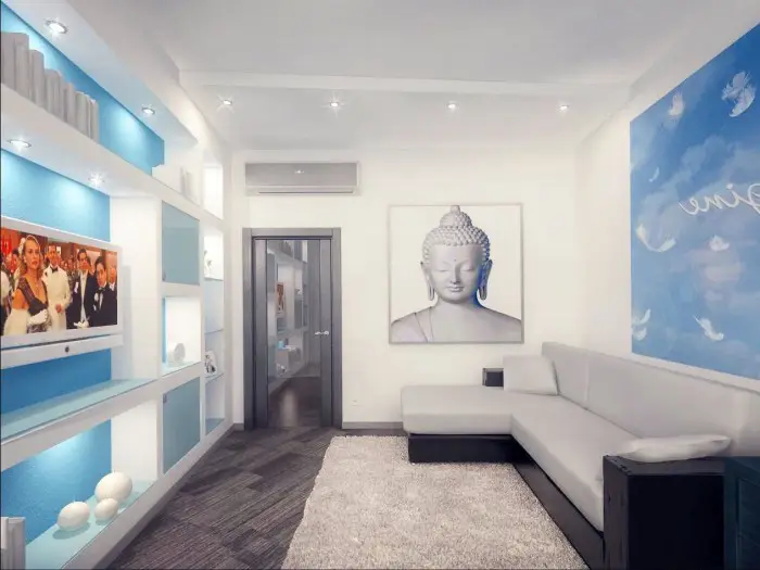 Was mehr ist, auf dem Bild oben werden alle oben genannten Maßnahmen durch Farbe und Licht verstärkt: Die langen Wände, die hell sind, erhalten noch viel Licht. Das Ergebnis ist offensichtlich – der Raum wird nicht als lang empfunden.