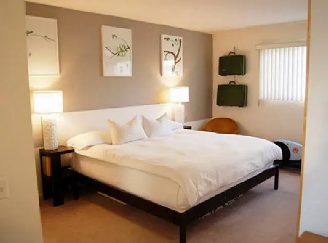 Im Allgemeinen nutzen kleine Zimmer dieselbe Regel zur Erhöhung des visuellen Raumes – Licht und Farbe. Zum Beispiel zeigt das Bild oben außer den Laterne über dem Bett auch eine Reihe von Bildern auf weißem Hintergrund. Ihre horizontale Anordnung kann die Wand, auf der sie sich befinden, visuell erweitern.