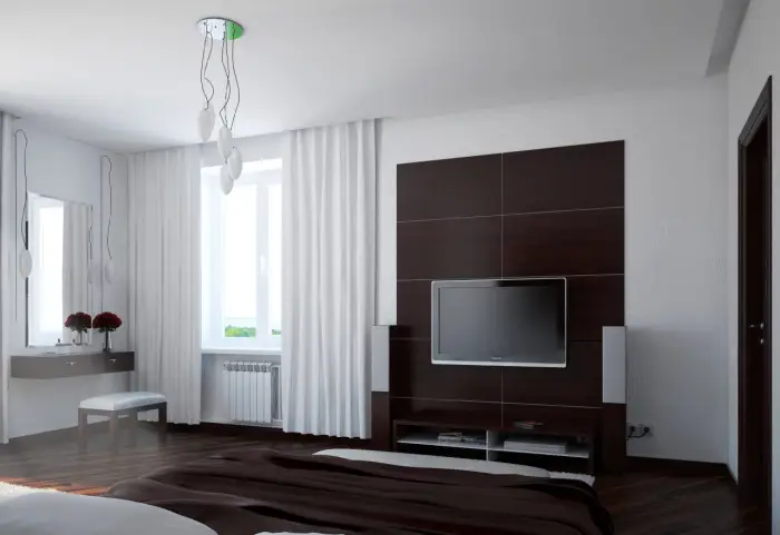 Die „Behandlung“ des Raumes einer engen und langen Schlafzimmertür ist auch möglich durch die Installation zusätzlicher Wände, welche die Länge des gesamten Raumes verkürzen durch das Schaffen zusätzlicher Sektionen. Diese Lösung in Kombination mit einer passenden Möbelaufstellung erzeugt einen exklusiven Effekt und kann den Raum vollständig von schmaleren Wänden befreien.