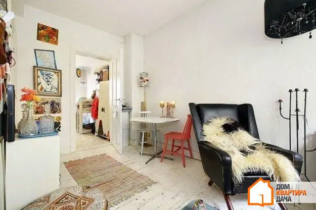 Aber beachten Sie, dass der lebhaften Dekor hier maßvoll eingesetzt wird. Dies half, den Raum mit interessanten Details zu füllen und ihn ausdrucksstark zu machen. Gleichzeitig wirkt die Wohnung nicht überladen, und die weißen Wände bieten einen perfekten Hintergrund für farbenfrohe Akzente.