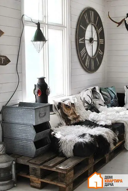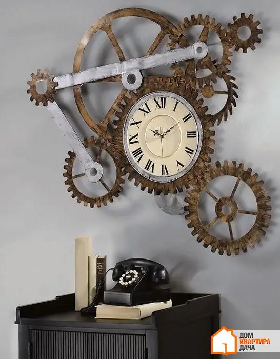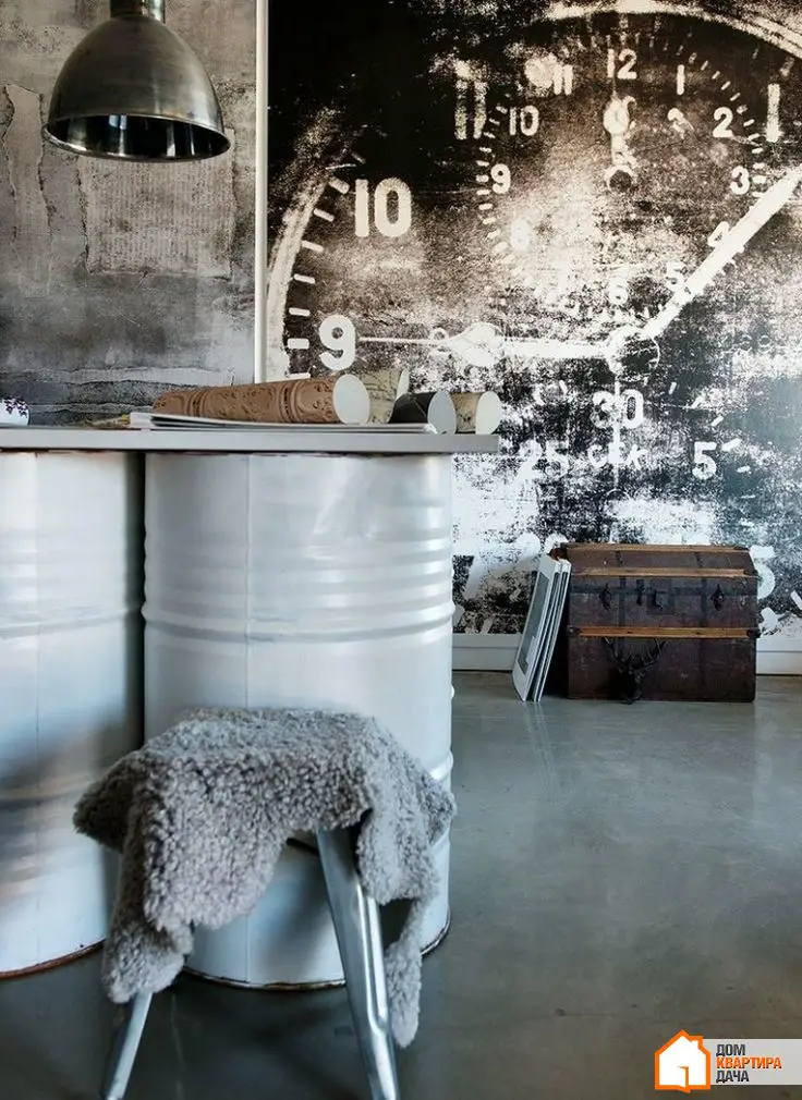 In minimalistischem Design des Industriestils werden authentische Werkzeug-Accessoires oder stilisierte Objekte verwendet. Zähne, Muttern, Ventile, Rohre werden nicht nach ihrem ursprünglichen Zweck verwendet, sondern als Elemente zur Raumdekoration. Wände werden mit Graffiti-Stil-Bildern, Werbeplakaten und leuchtenden Schildern geschmückt.