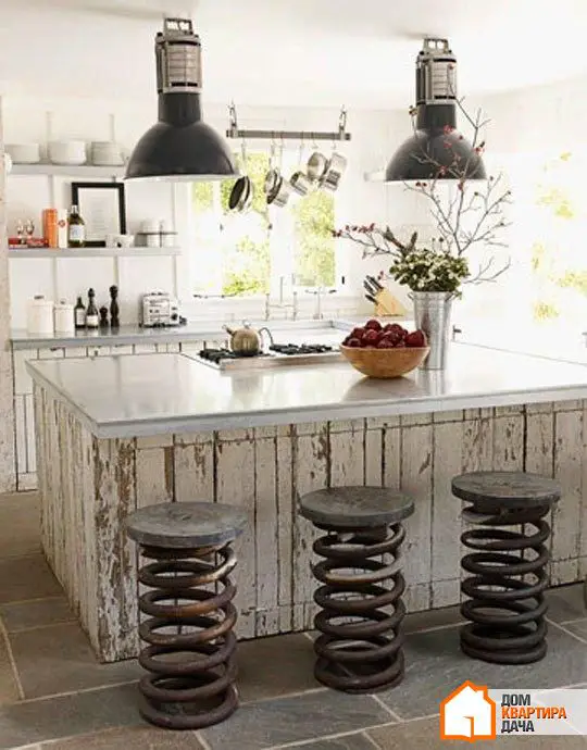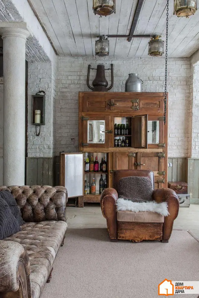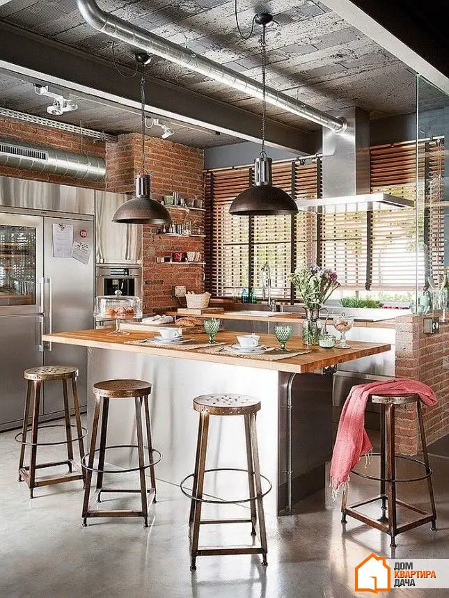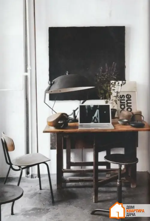 Die Hauptbestandteile des Stils sind texturierte Materialien: abgenutztes und unverarbeitetes Holz, grobstrukturierter Stein, Backsteinmauerwerk, raue Betonflächen und natürlich Metall. Das Metall sollte matt sein, perfekt passen Stahl, Eisen, Aluminium, vielleicht mit Rost oder Patina. Glänzendes Gold und Messing sollten nicht verwendet werden, da sie zu viel Glanz verleihen und dem Stil widersprechen. Ein wesentlicher Merkmal des Stils ist die Anwesenheit offener Rohrleitungen, Luftkanäle und Balken. Echte oder stilisierte solche Elemente verleihen dem Raum zusätzliche Textur.