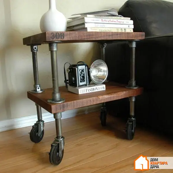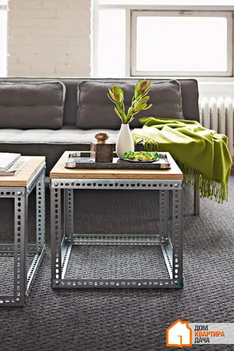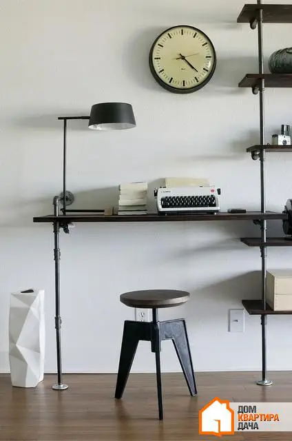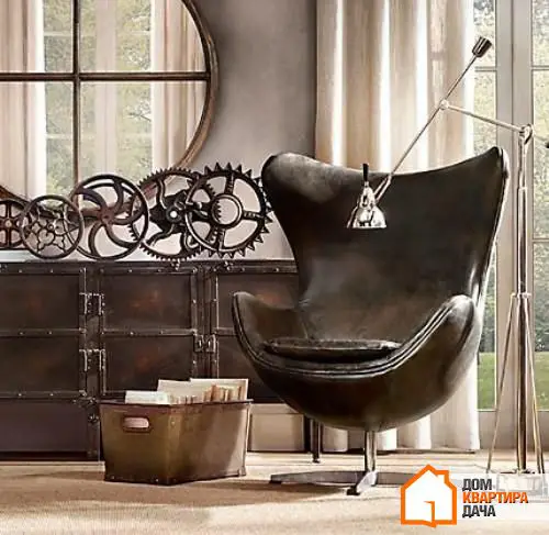 Möbel können vintage oder modern sein, aber auf den Stil der Manufaktur hinweisen. Alte Gegenstände, die auf Flohmärkten gefunden wurden, sind hervorragende Elemente für Möbel. Untergestelle von Nähmaschinen, offene Bücherregale mit Rohrgerüst und ein Arbeitsbank, umgewandelt in einen Esszimmer-Tisch – alle diese Gegenstände passen perfekt in einen Industrie-Interieur. Weiche Sofas sind auch passend, aber einfarbig und mit maximal einfachen Formen ohne Anzeichen von überflüssigem Dekor.