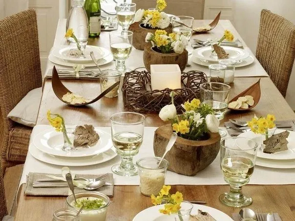 Skandinavier schätzen Einfachheit in allem, daher wählen Sie keramische Teller einfacher und sanfter Formen. Eine schöne Erscheinung ergibt sich mit Teller mit einfachem und nicht übertriebenen Muster. Gläser aus dickem Glas, Leinenservietten und ein Blumenstrauß von Feldblüten passen perfekt zur Servierung. Im Herbst können Sie Blumen durch eine Komposition aus Zweigen und Trockenblüten ersetzen.