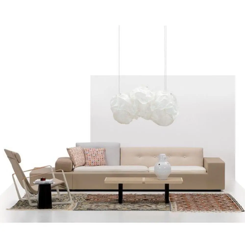 Das Polder Sofa ist ein zeitgenössisches Stück, das innerhalb weniger Jahre Klassiker wurde: Die niederländische Designerin Hella Jongerius stellte ihre Kreation 2005 vor. Der Name leitet sich aus dem Niederländischen ab und bedeutet \"eine mit Dämmen und Drainagekanälen entwässerte Fläche\" – sehr passend für ein niedriges, flaches, asymmetrisches Sofa. Das Sofa hat einen Holzrahmen, der mit Stoff bezogen ist. Es bietet Platz für vier Kissen mit unterschiedlichen Formen. Um sie herum befindet sich ein austauschbarer Armlehnen, der beispielsweise als Tisch für Magazine oder Geschirr dienen kann. Das Polder Sofa ist mit Materialien aus fünf verschiedenen Arten bezogen – dies unterstreicht die Asymmetrie zusätzlich. Ein besonderer Akzent sind die großen Knöpfe auf den Kissen, die aus natürlichen Materialien wie Bambus und Perlmutt hergestellt sind. Diese Knöpfe sind mit Fäden genäht, die sich vom Kissenhintergrund unterscheiden. Das Polder Sofa ist ein eindrucksvolles Beispiel dafür, wie verschiedene Elemente harmonisch miteinander kombiniert werden können. Verschiedene Konfigurationen werden von Vitra produziert und kosten fast 10.000 Dollar.