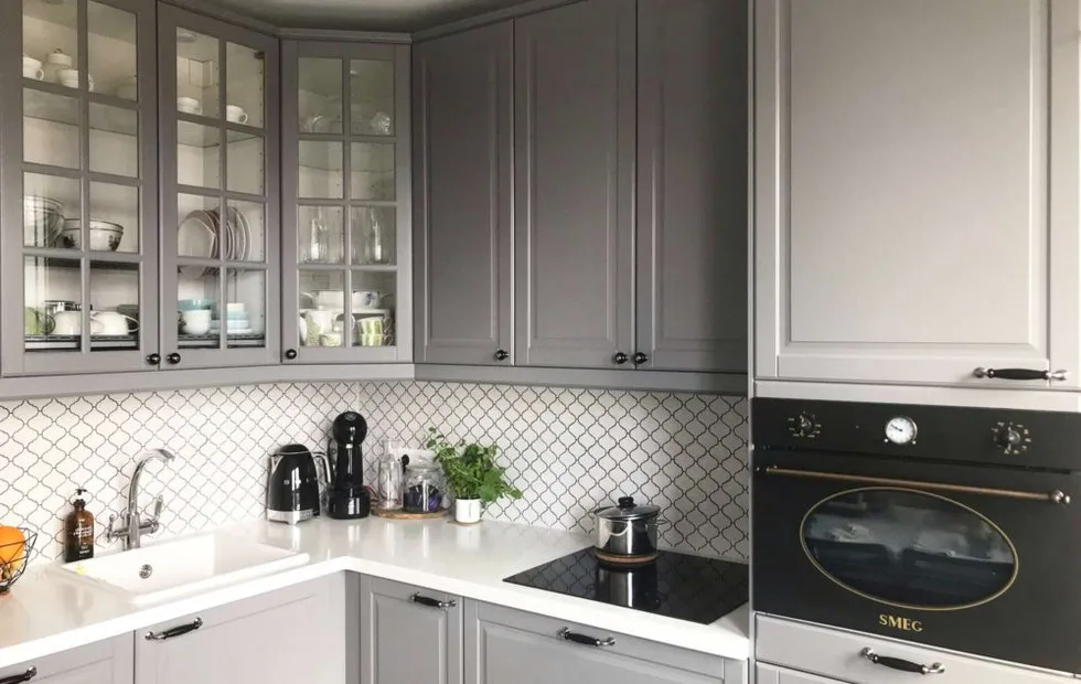 - 300.000 Rubel: Küchen-Garnitur nach Maß mit bemalten Fassaden aus MDF. Umfangreiche Auswahl qualitativer Einrichtungsteile und Arbeitsfläche aus künstlichem Stein;
